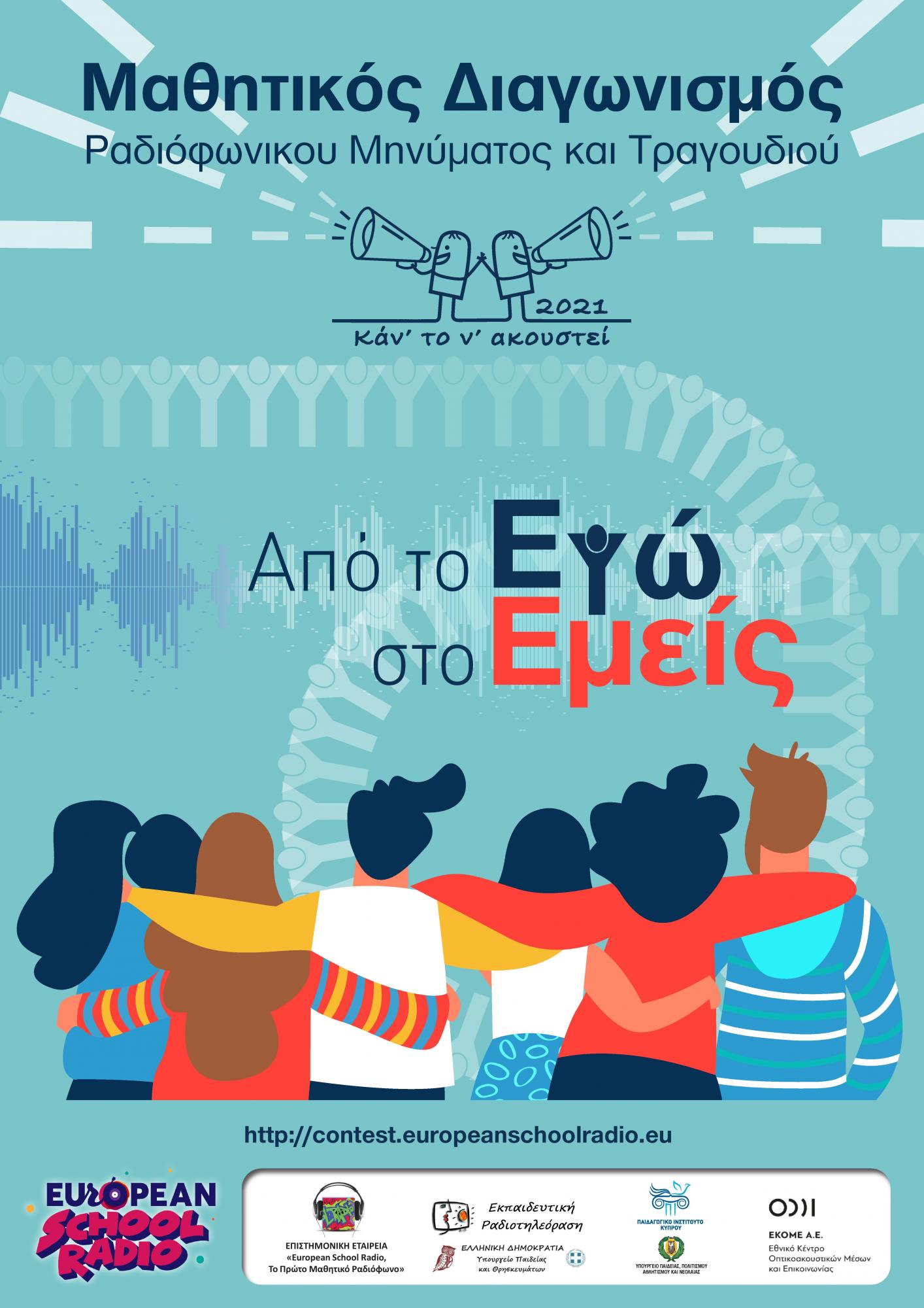 Το 7ο Πανελλήνιο Φεστιβάλ Μαθητικού Ραδιοφώνου European School Radio 2021, απευθύνεται στα σχολεία Πρωτοβάθμιας και Δευτεροβάθμιας Εκπαίδευσης της Ελλάδας και της Κύπρου. Στο πλαίσιο του Φεστιβάλ περιλαμβάνεται και η Τελετή Βράβευσης του Διαγωνισμού Μηνύματος & Τραγουδιού «Κάν’ το ν’ ακουστεί 2021» με θέμα «Από το Εγώ στο Εμείς».