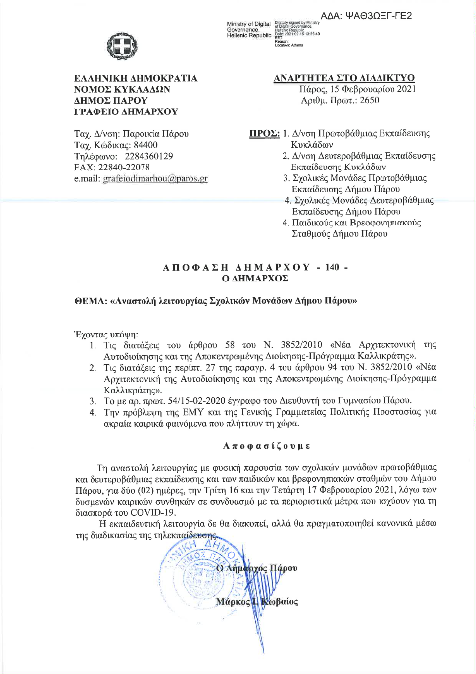 Την αναστολή λειτουργίας με φυσική παρουσία των σχολικών μονάδων πρωτοβάθμιας και δευτεροβάθμιας εκπαίδευσης και των παιδικών και βρεφονηπιακών σταθμών του Δήμου Πάρου, για δύο (2) ημέρες, Την Τρίτη και την Τετάρτη 17 Φεβρουαρίου 2021, λόγω των δυσμενών καιρικών συνθηκών σε συνδυασμό με τα περιοριστικά μέτρα που ισχύουν για την διασπορά του COVID-19.