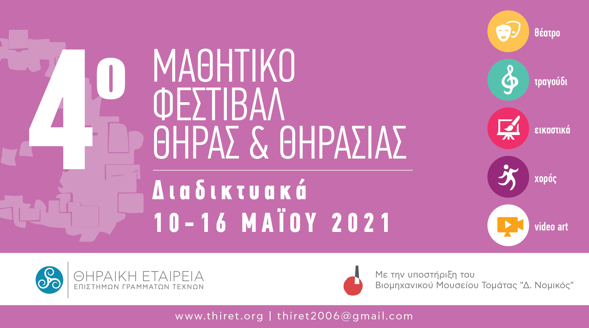 Το 4 ο Μαθητικό Φεστιβάλ Θήρας και Θηρασίας θα πραγματοποιηθεί την εβδομάδα 10-16 Μαΐου 2021. Κατά τη διάρκεια της εβδομάδας αυτής θα προβάλλονται τα έργα και οι δράσεις των παιδιών μας, δίνοντας τους έτσι ένα βήμα για έκφραση, επικοινωνία και αλληλεπίδραση. Η φετινή θεματολογία είναι ελεύθερη, αρκεί να μπορεί να προβληθεί διαδικτυακά.