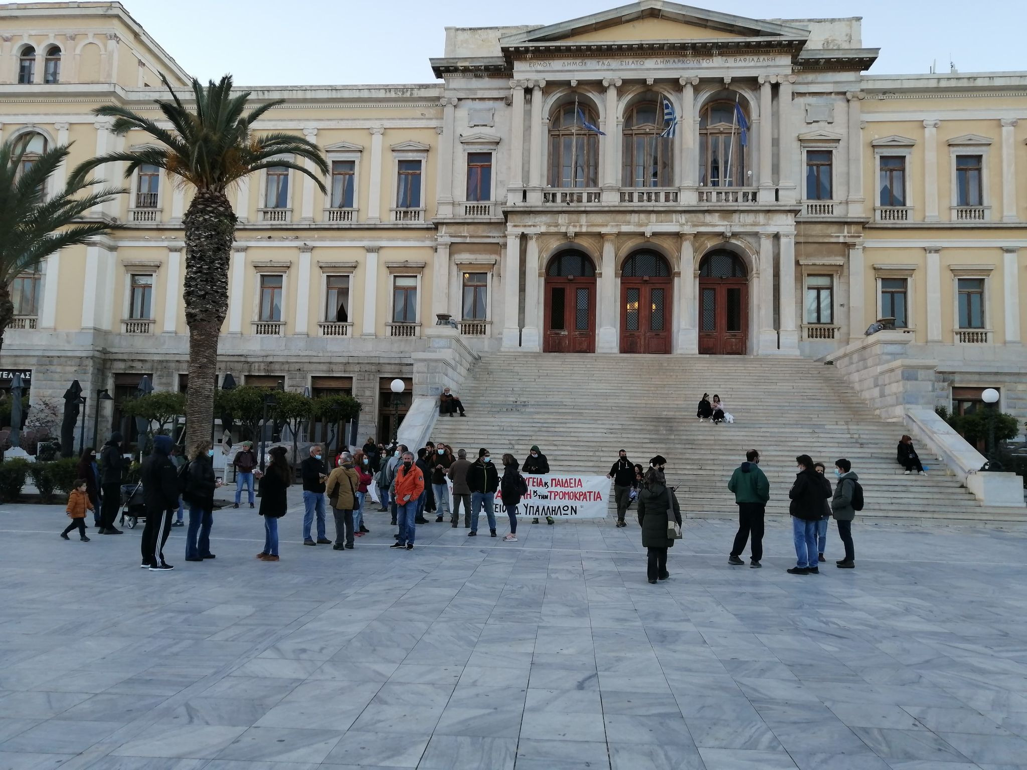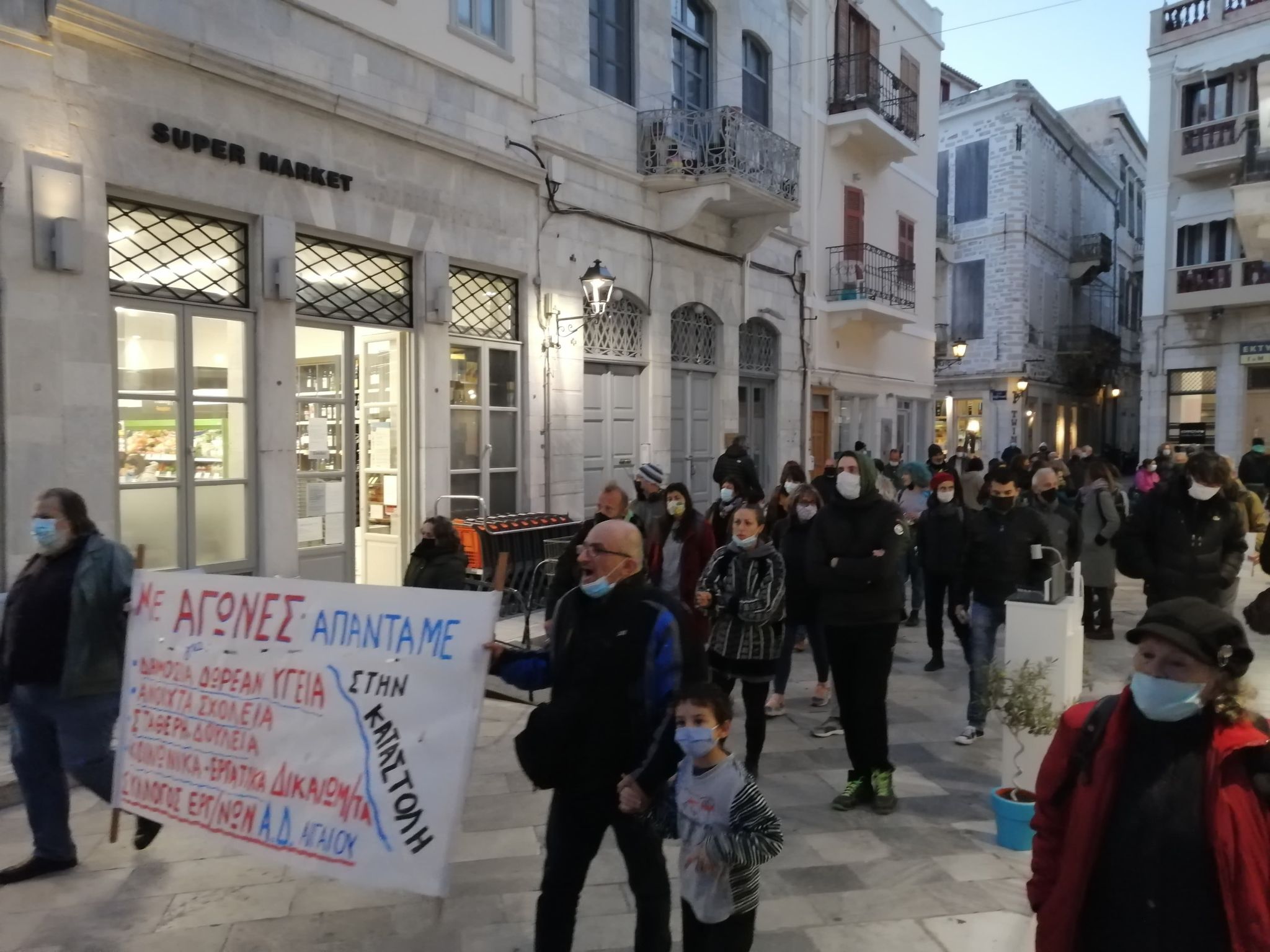 Σημειώνεται πως αμέσως μετά τη συγκέντρωση διαμαρτυρίας στην πλατεία Μιαούλη ακολούθησε πορεία στο κέντρο της Ερμούπολης.