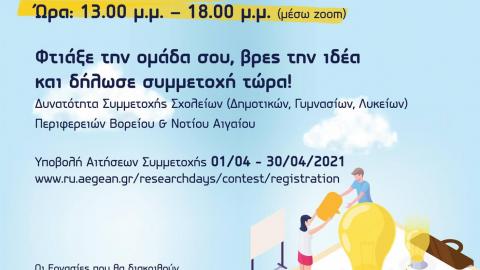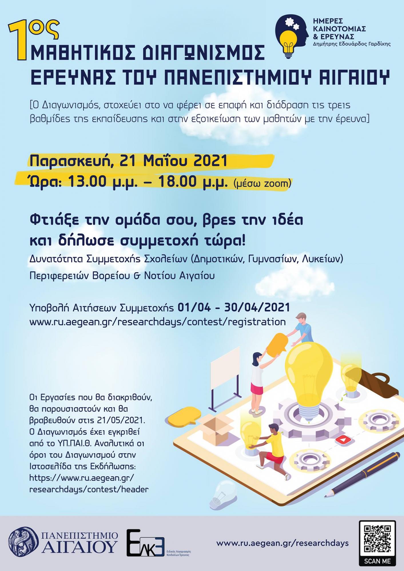 Στο πλαίσιο των «Ημερών Καινοτομίας & Έρευνας Δημήτρης Εδουάρδος Γαρδίκης», το Πανεπιστήμιο Αιγαίου διοργανώνει τον 1ο Διαγωνισμό Έρευνας για μαθητές της Πρωτοβάθμιας και Δευτεροβάθμιας Εκπαίδευσης Βορείου και Νοτίου Αιγαίου.