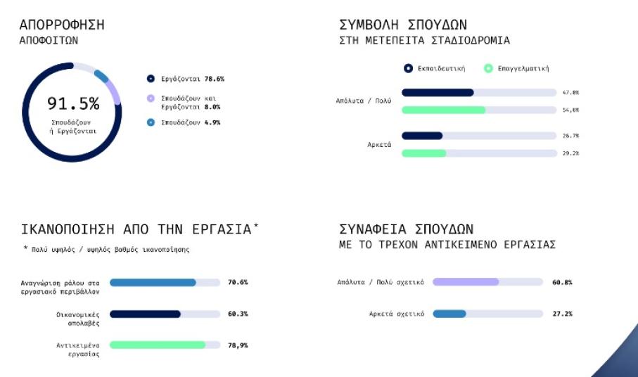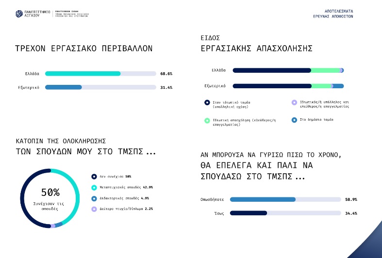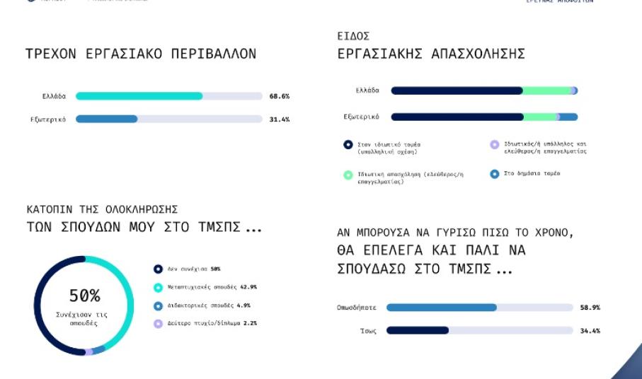 Πιο συγκεκριμένα, η έρευνα αποτυπώνει ένα εξαιρετικά υψηλό επίπεδο αποροφησιμότητας τους, καθώς η συντριπτική πλειοψηφία των συμμετεχόντων (91,5%) δήλωσε ότι την περίοδο διεξαγωγής της παρούσας έρευνας «εργάζονται» (78,6%) ή «σπουδάζουν και εργάζονται» (8,0%) ή «σπουδάζουν» (4,9%). Τα ποσοστά αυτά έχουν ακόμη μεγαλύτερη αξία, καθώς από τους συμμετέχοντες που δήλωσαν ότι «εργάζονται» ή «σπουδάζουν και εργάζονται», η μεγάλη πλειοψηφία αυτών (60,8%) θεωρεί ότι το αντικείμενο εργασίας τους είναι «πολύ» ή «απόλυτα» σχετικό με τις σπουδές τους στο ΤΜΣΠ. Ενδιαφέρον επίσης παρουσιάζει το γεγονός ότι η πλειοψηφία των συμμετεχόντων (59,4%) αξιολόγησαν τις σπουδές τους στο ΤΜΣΠΣ ως «πολύ» ή «απόλυτα» βοηθητικές στη μετέπειτα σταδιοδρομία τους, ενώ ένα άλλο σημαντικό ποσοστό αυτών (27,2%), ως «αρκετά» βοηθητικές.