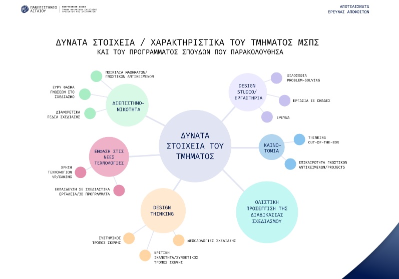 Τέλος, από την επεξεργασία των απαντήσεων των συμμετεχόντων ως προς τα «δυνατά σημεία» που διακρίνουν στο πρόγραμμα σπουδών, προκύπτει ότι οι απόφοιτοι προκρίνουν ως πλέον σημαντικά τη διεπιστημονικότητα, καινοτομία και επικαιρότητα του προγράμματος σπουδών, την έμφαση στις νέες τεχνολογίες, τον εργαστηριακό (και προσανατολισμένο σε πραγματικά σχεδιαστικά προβλήματα) χαρακτήρα πολλών μαθημάτων (ιδίως των design studios), την ολιστική προσέγγιση της διαδικασίας σχεδιασμού, τη σύνδεση θεωρίας και πράξης, την καλλιέργεια συνθετικού και κριτικού τρόπου σκέψης.