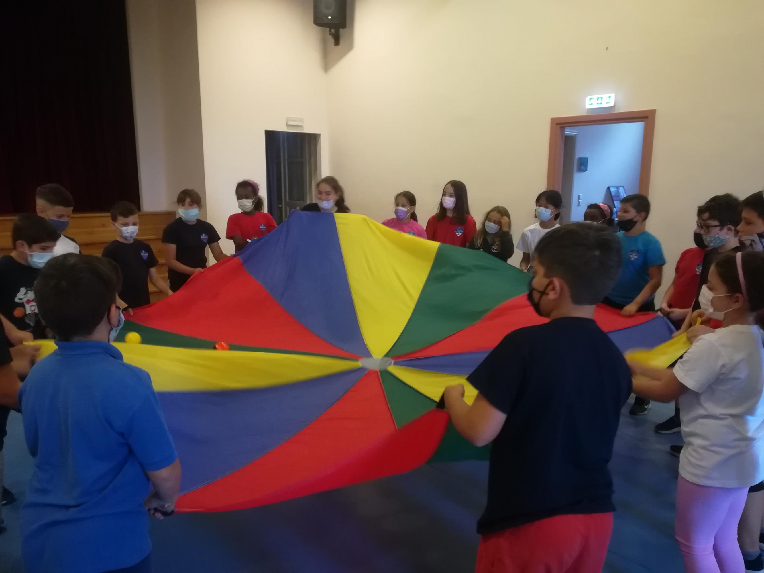 Στη συνέχεια, τα παιδιά ανακάλυψαν τι έκρυβε η βαλίτσα της κυρίας Μυρτώς. Ένα τεράστιο πανί προκάλεσε ενθουσιασμό, γέλια, χαρά και έδωσε έναυσμα για συνεργασία, συντονισμό και ομαδικότητα.