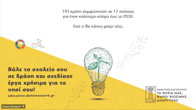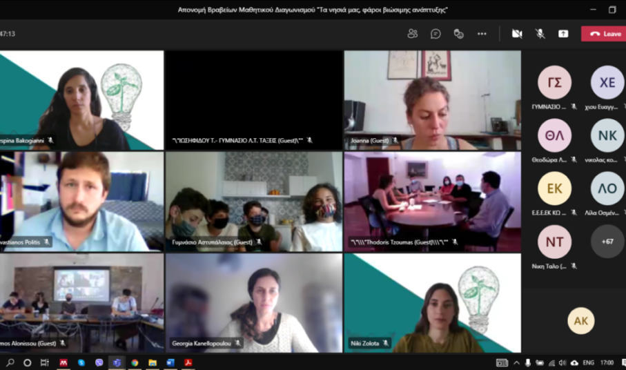 Ο 1ος Μαθητικός Διαγωνισμός «Τα νησιά μας, φάροι βιώσιμης ανάπτυξης» ολοκληρώθηκε σε ένα γιορτινό και ευχάριστο κλίμα με την Απονομή Βραβείων που πραγματοποιήθηκε διαδικτυακά, παρουσία της κας Αλεξάνδρας Σδούκου, Γ.Γ. του Υπουργείου Περιβάλλοντος & Ενέργειας.