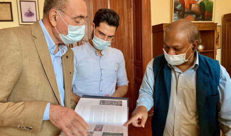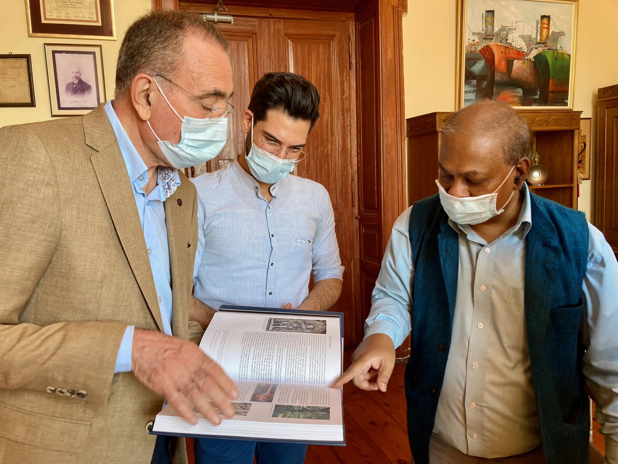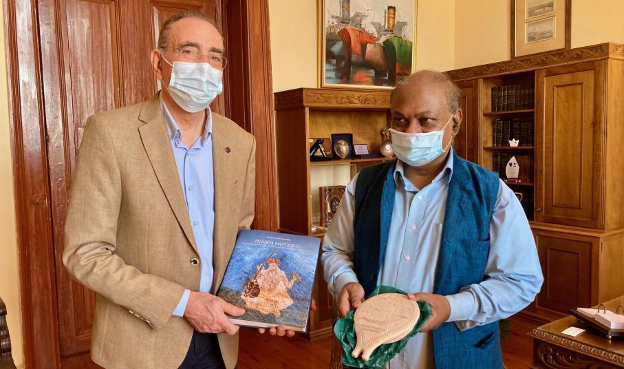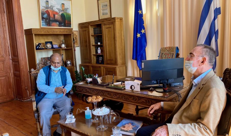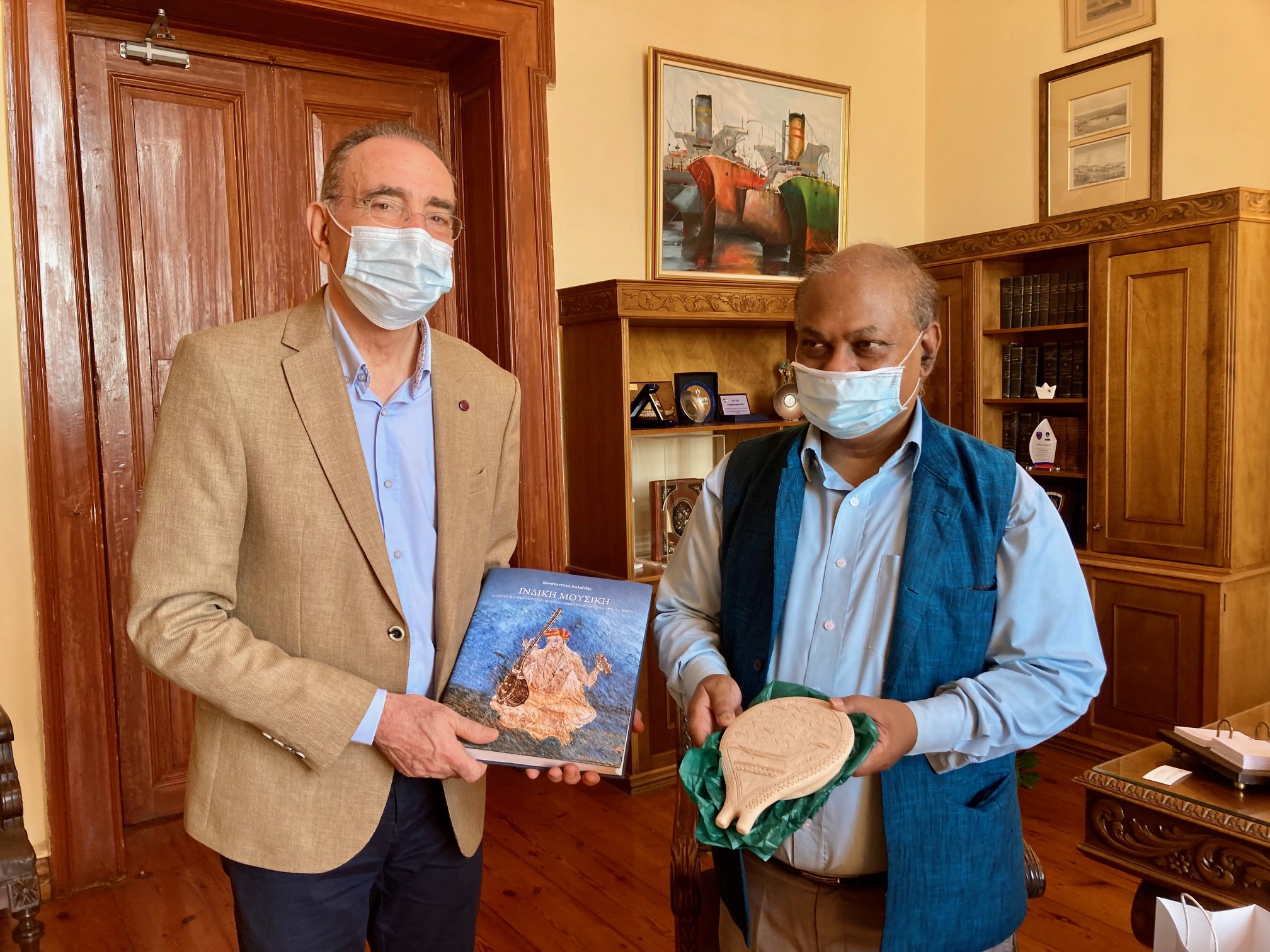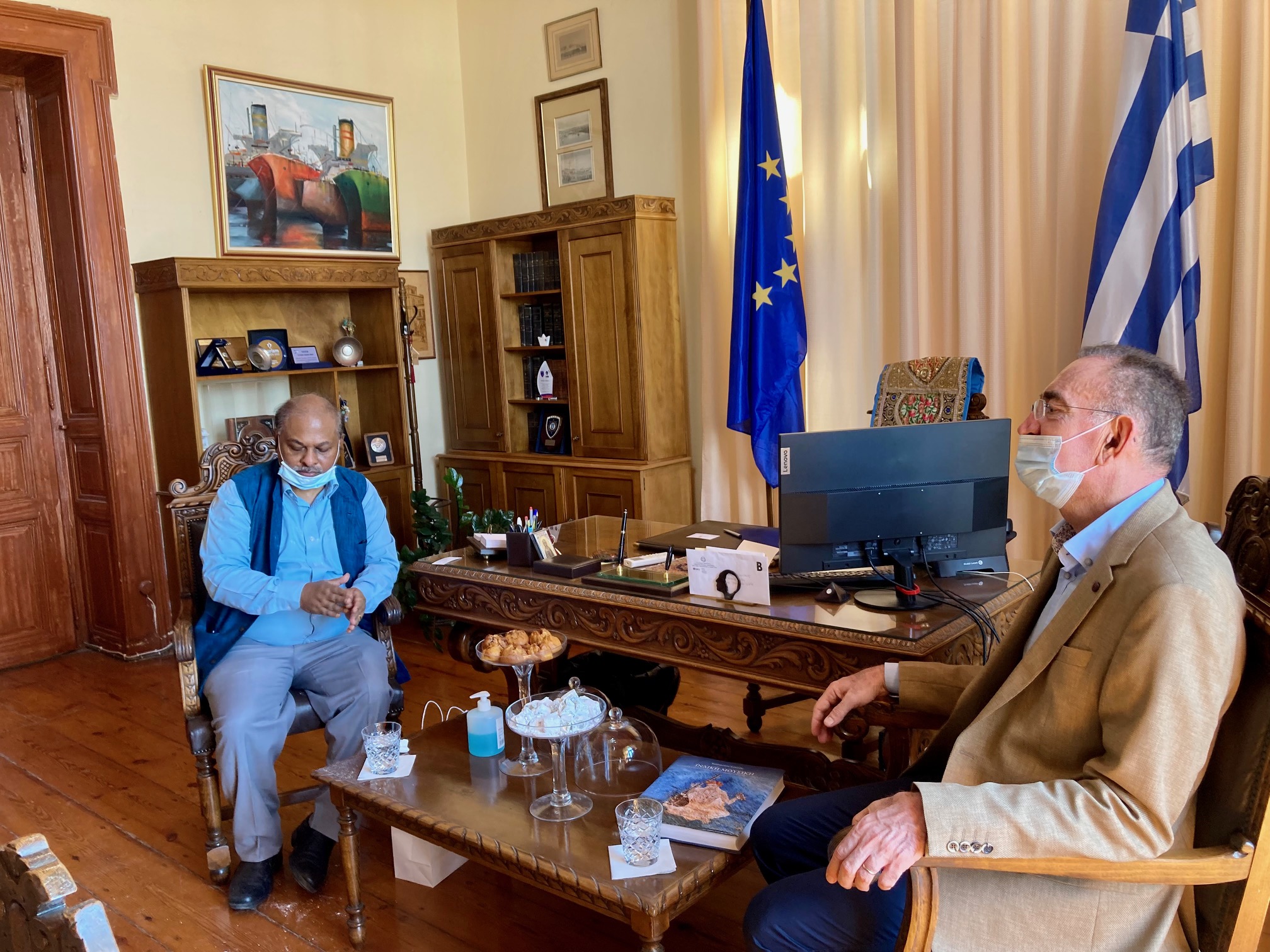 Τον Πρέσβη της Ινδίας κ. Amrit Lugun υποδέχθηκε σήμερα, Παρασκευή 03 Σεπτεμβρίου 2021, στο Δημαρχιακό Μέγαρο, ο Δήμαρχος Σύρου - Ερμούπολης κ. Νικόλαος Λειβαδάρας, παρουσία της Εντεταλμένης Δημοτικής Συμβούλου σε θέματα Παιδείας κας Ειρήνης Δράκου, στο πλαίσιο προγραμματισμένης επίσκεψής του στο νησί μας με αφορμή την πραγματοποίηση της μουσικοχορευτικής παράστασης «Tales of Sitar» που διοργάνωσε η χοροθεατρική ομάδα «Μεταμορφώσεις» σε συνεργασία με την Ινδική Πρεσβεία για τον εορτασμό των 75 χρόνων από την ημέρα ανεξαρτησίας της Ινδίας.