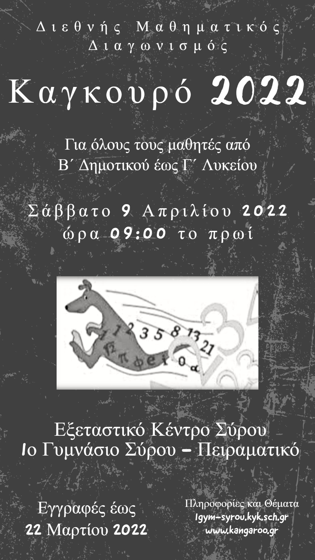Σας ενημερώνουμε ότι το 1ο Γυμνάσιο Σύρου-Πειραματικό θα αποτελέσει το Εξεταστικό Κέντρο της Σύρου για τον Διεθνή Μαθηματικό Διαγωνισμό «Καγκουρό» 2022.