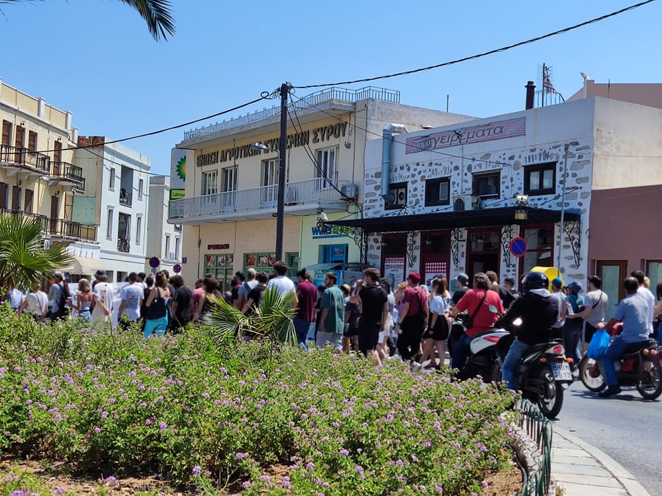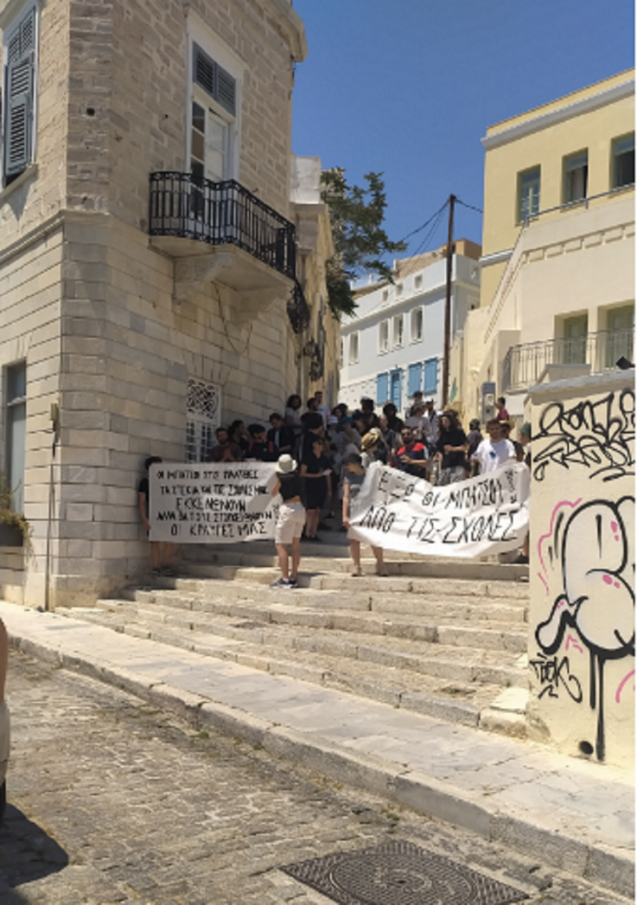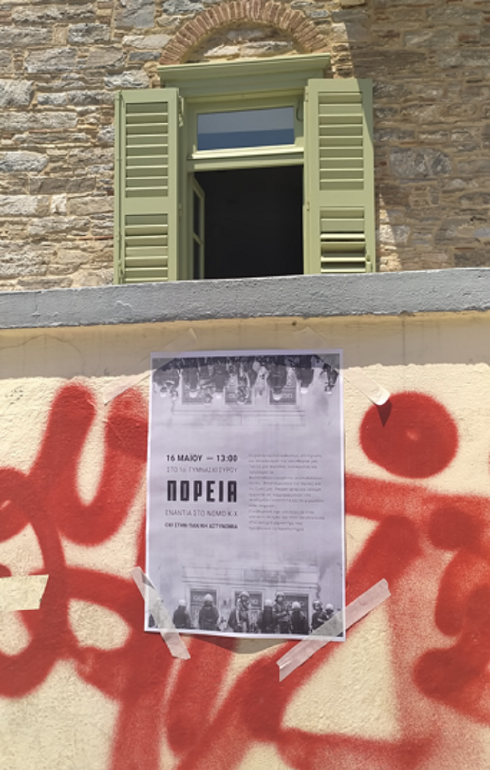 Νωρίς το μεσημέρι της Δευτέρας 16/05 συγκεντρώθηκαν στο χώρο του Πανεπιστημίου Αιγαίου ο Φοιτητικός Σύλλογος Σύρου του Τμήματος Μηχανικών Σχεδίασης Προϊόντων και Συστημάτων Πανεπιστημίου Αιγαίου για να δηλώσουν τη θέση τους ενάντια σε κάθε μορφή αστυνόμευσης στα πανεπιστήμια αλλά και τη στήριξη και αλληλεγγύη τους στους φοιτητές του ΑΠΘ και στα υπόλοιπα πανεπιστημιακά ιδρύματα. Οι φοιτητές, αφού συγκεντρώθηκαν, μοίρασαν φυλλάδια με τα αιτήματά τους και φώναξαν συνθήματα ενάντια στην εφαρμογή του συγκεκριμένου νόμου. Στη συνέχεια ξεκίνησε πορεία η οποία πέρασε από κεντρικούς δρόμους του νησιού και κατέληξε έξω από το αστυνομικό τμήμα Ερμούπολης.