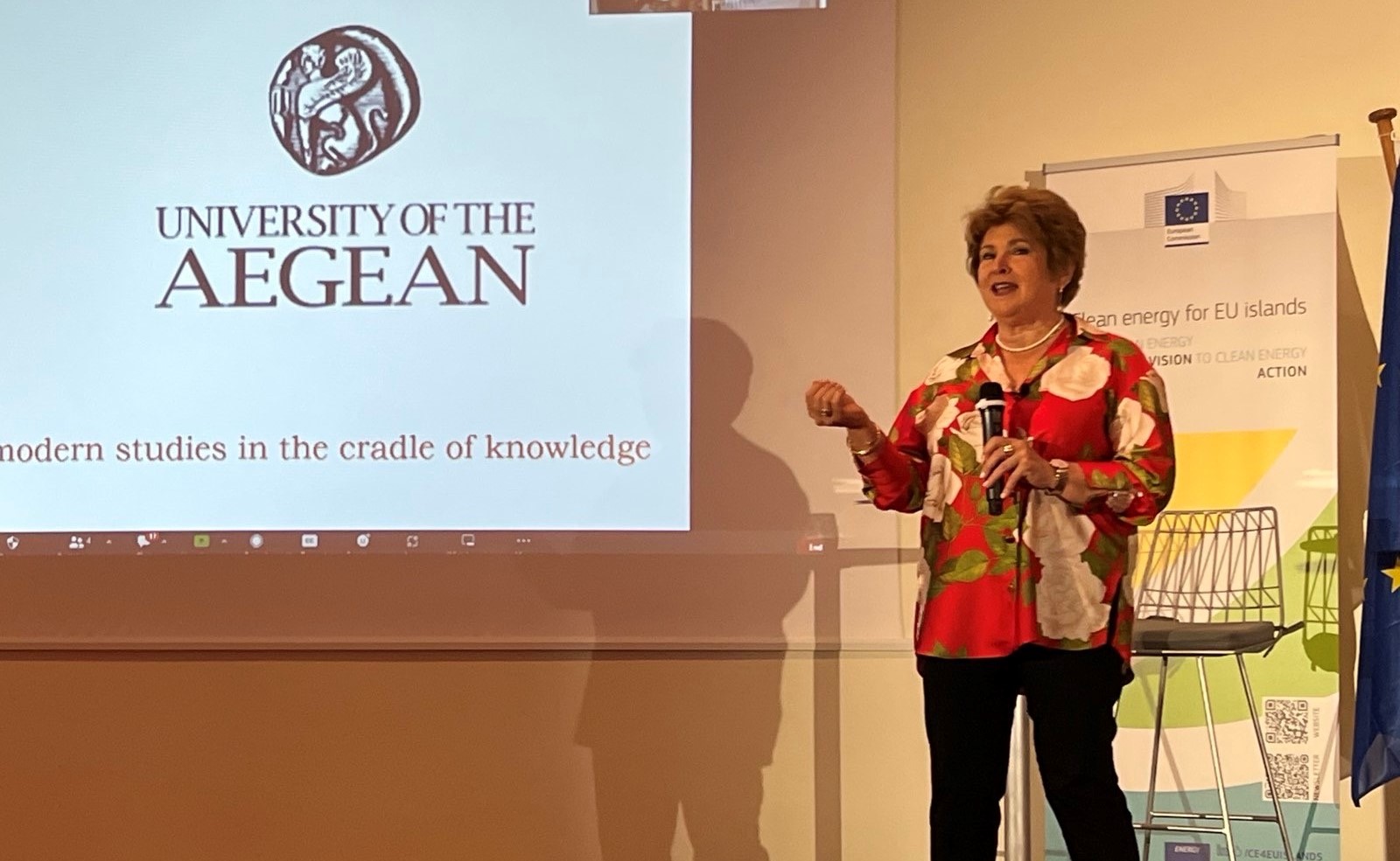 Στο πλαίσιο της ομιλίας της η Πρυτάνισσα παρουσίασε το διεπιστημονικό ερευνητικό έργο που διεξάγεται στο Πανεπιστημίου Αιγαίου μέσω της διδασκαλίας και έρευνας των Τμημάτων του, και ιδιαίτερα του Τμήματος Περιβάλλοντος, του Τμήματος Ωκεανογραφίας και Θαλάσσιων Βιοεπιστημών και του Τμήματος Γεωγραφίας και τις σημαντικές δράσεις του Ιδρύματος για την προώθηση της πράσινης μετάβασης στα νησιά, όπως το θερινό σχολείο «Islands as Laboratories: The case of Lesvos», τη συμμετοχή του Πανεπιστημίου στο πρόγραμμα ηλεκτροκίνησης στην Αστυπάλαια και την διεξαγωγή των «Living Labs» για την υποστήριξη των νησιωτικών κοινοτήτων και της επιχειρηματικότητας.