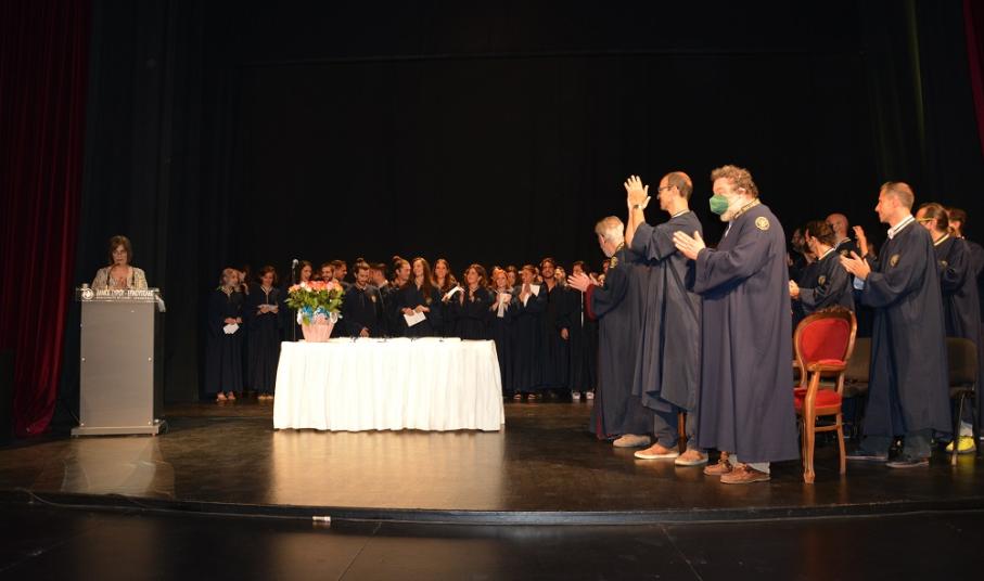 Καταχειροκροτούμενος ανέβηκε στην σκηνή του θεάτρου Απόλλων ο εκπρόσωπος φοιτητών και φοιτητριών του τμήματος, Ηλίας Λιάγκος ο οποίος, σε ένα πιο ανάλαφρο κι εύθυμο κλίμα, ευχαρίστησε τους καθηγητές που τους έδειξαν το δρόμο και τους έμαθαν τι σημαίνει πανεπιστήμιο. Ένας χώρος που , όπως είπε, είναι δικός τους τους επιτρέπει να εκφράζουν ελεύθερα τις ανησυχίες τους, να προβληματίζονται, να διαμορφώνονται ολιστικά και να μαθαίνουν να αλληλεπιδρούν αρμονικά. “Ελπίζω σε ένα ραντεβού στο μέλλον σε κάθε επίπεδο και με κάθε τρόπο” ευχήθηκε κλείνοντας την ομιλία του.