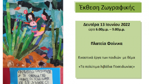 Με την υποστήριξη της τοπικής κοινότητας Φοίνικα και του Συλλόγου Γονέων του νηπιαγωγείου μας, διοργανώνουμε υπαίθρια εικαστική των έργων των παιδιών, την Δευτέρα 13 Ιουνίου 2022, και ώρα 6.00μ.μ. – 9.00μ.μ.