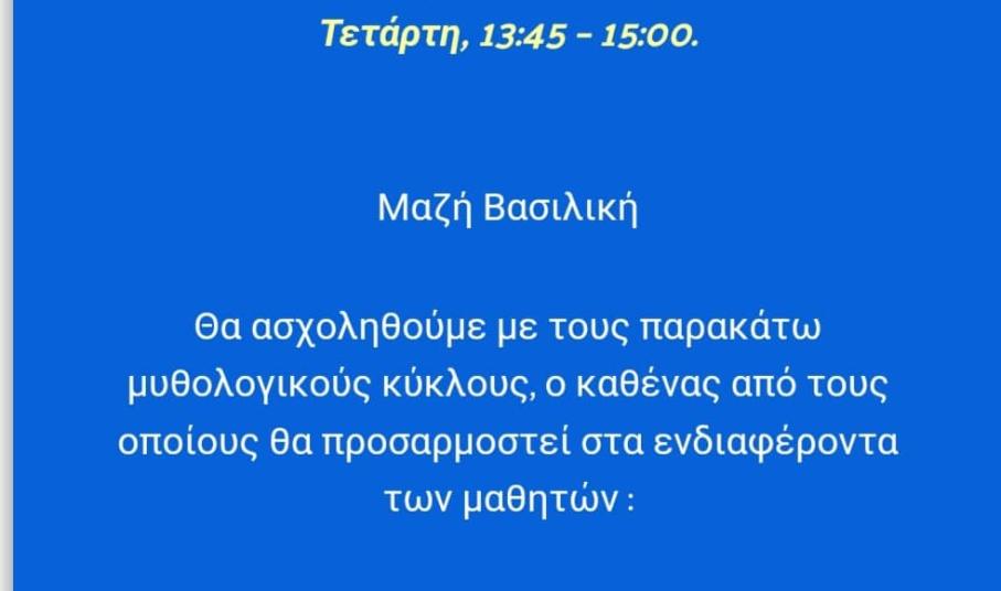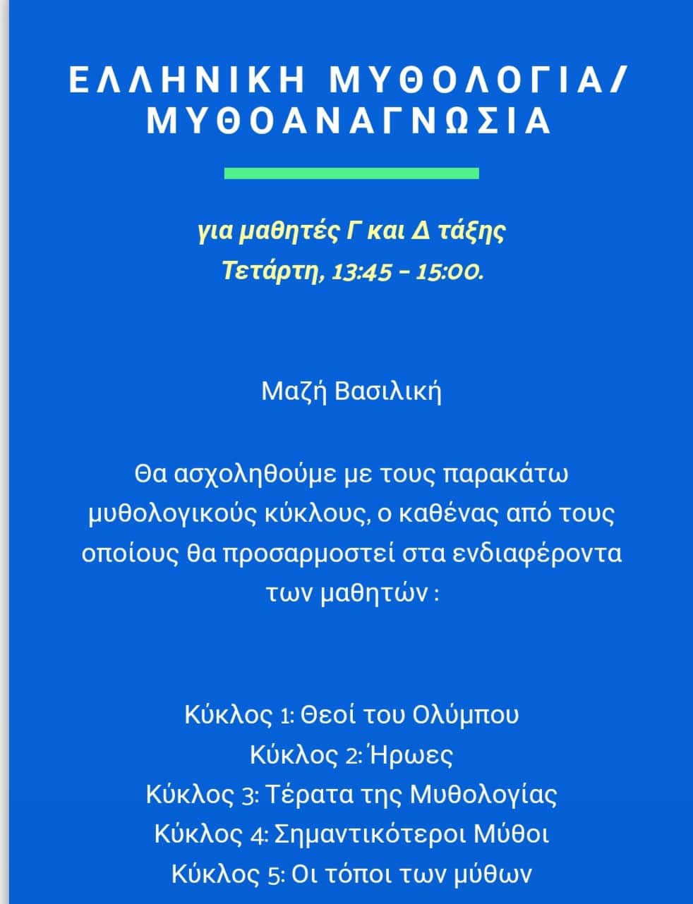 Ελληνική μυθολογία / Μυθοαναγνωσία, Βασιλική Μαζή (Γ και Δ τάξης, Τετάρτη, 13:45 – 15:00)