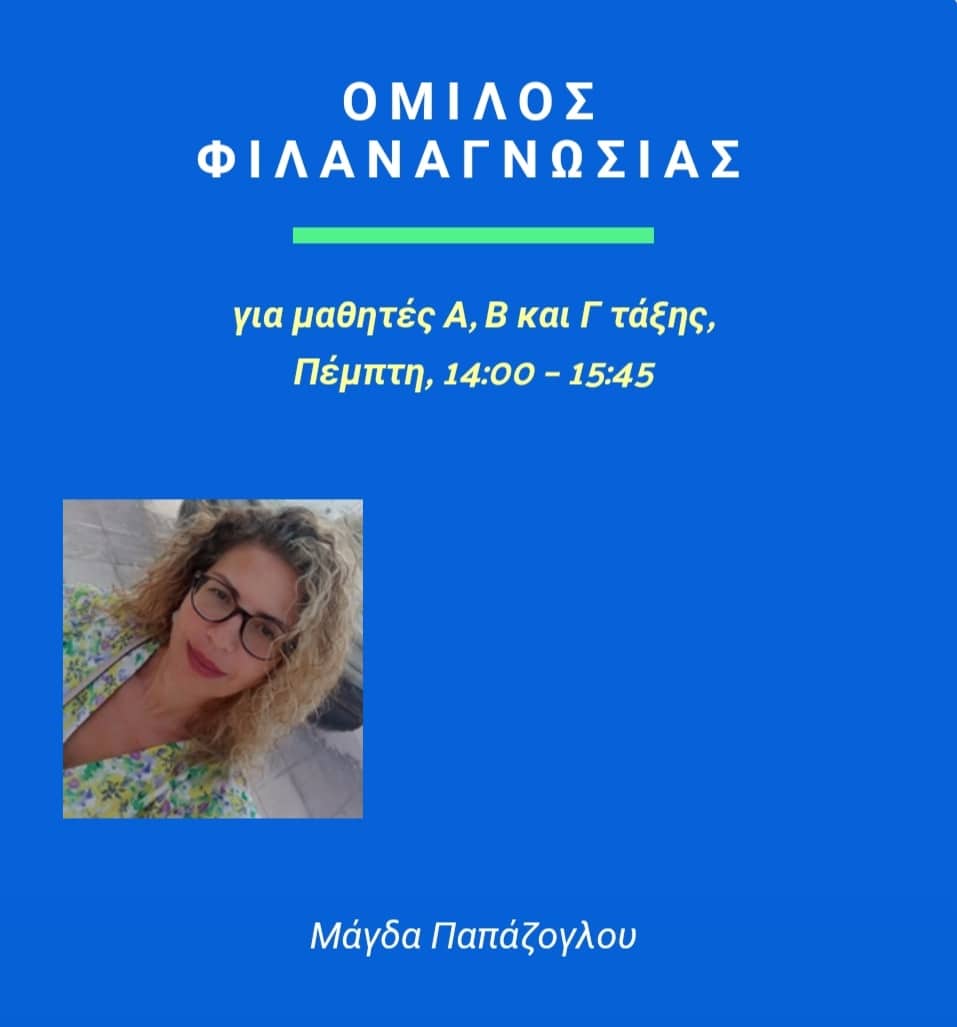 Όμιλος φιλαναγνωσίας, Μάγδα Παπάζογλου (Α, Β και Γ τάξης, Πέμπτη, 14:00 – 15:45)