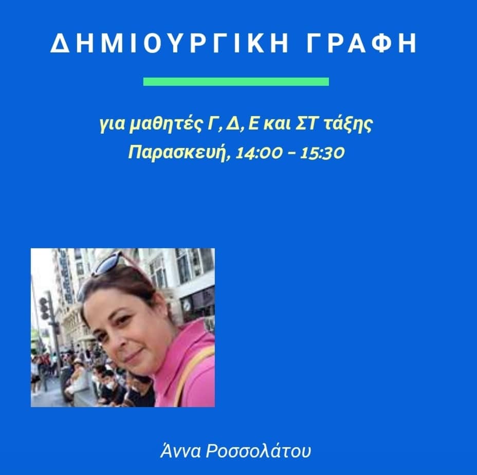 Δημιουργική γραφή, Άννα Ροσσολάτου (Γ, Δ, Ε και ΣΤ τάξης, Παρασκευή, 14:00 – 15:30)