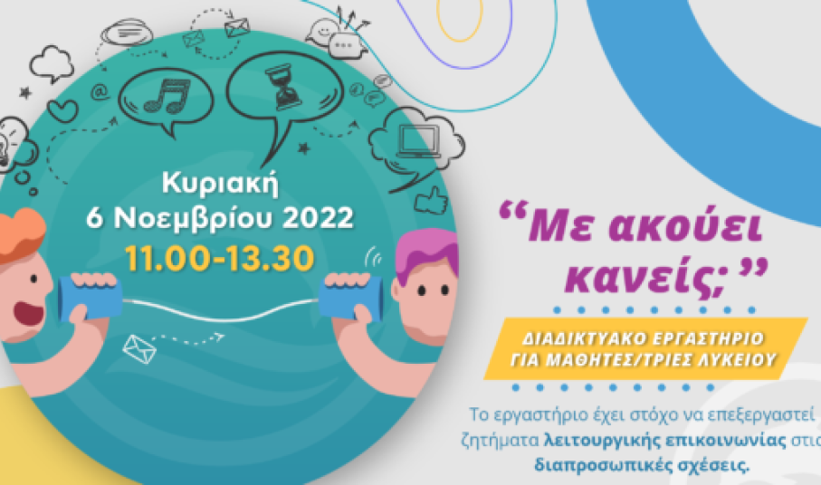 «Με ακούει κανείς;» – Κυριακή 6 Νοεμβρίου 2022, 11.00 – 13.30. Στόχος του εργαστηρίου είναι η επεξεργασία ζητημάτων λειτουργικής επικοινωνίας στις διαπροσωπικές σχέσεις.