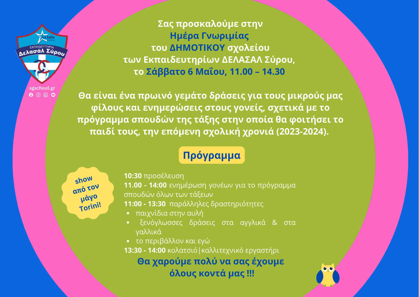 Τα Εκπαιδευτήρια ΔΕΛΑΣΑΛ Σύρου προσκαλούν όλους, γονείς και παιδιά (τάξεων Δημοτικού) της Σύρου, αυτό το Σάββατο 6 Μαΐου στο OPEN DAY του Δημοτικού, στις εγκαταστάσεις των Εκπαιδευτηρίων, σε μια ημέρα γνωριμίας με πολλές δραστηριότητες, ξενάγηση στους χώρους και πολλές εκπλήξεις.
