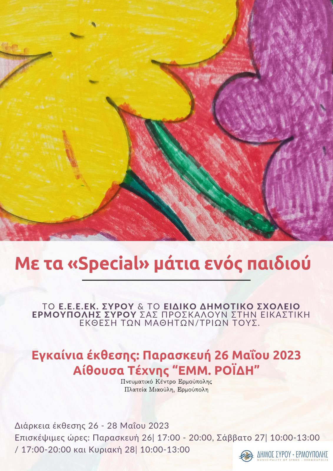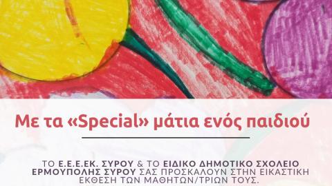 Μία ξεχωριστή έκθεση θα φιλοξενείται από την Παρασκευή 26 μέχρι και την Κυριακή 28 Μάιου στην αίθουσα τέχνης Εμμ. Ροΐδη στο Πνευματικό Κέντρο Ερμούπολης. Οι μαθητές και οι μαθήτριες του Ειδικού Δημοτικού Σχολείου Ερμούπολης Σύρου και του ΕΕΕΕΚ Σύρου εκθέτουν τα έργα τους και περιμένουν τον κόσμο του νησιού να τιμήσει με την παρουσία του την προσπάθειά τους.