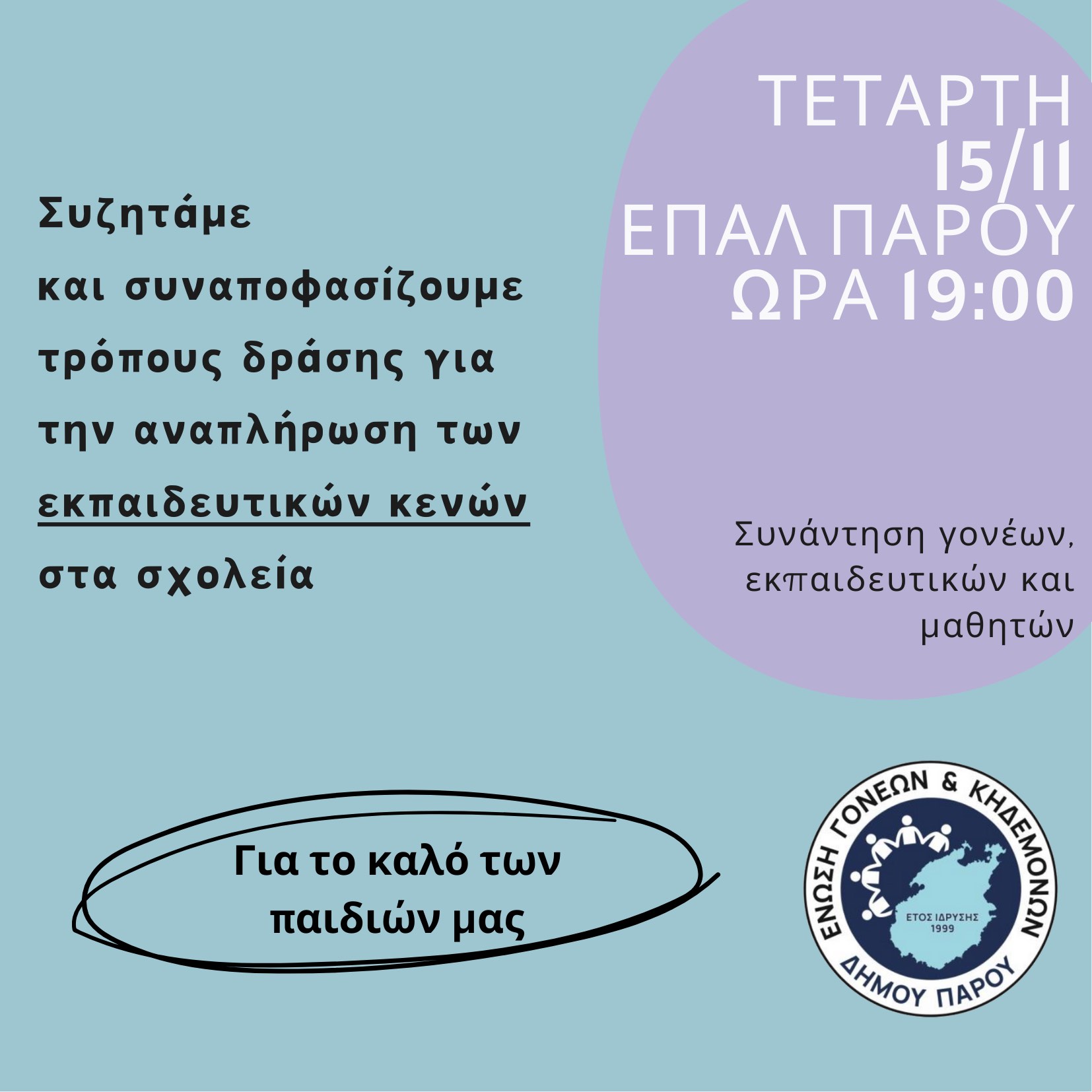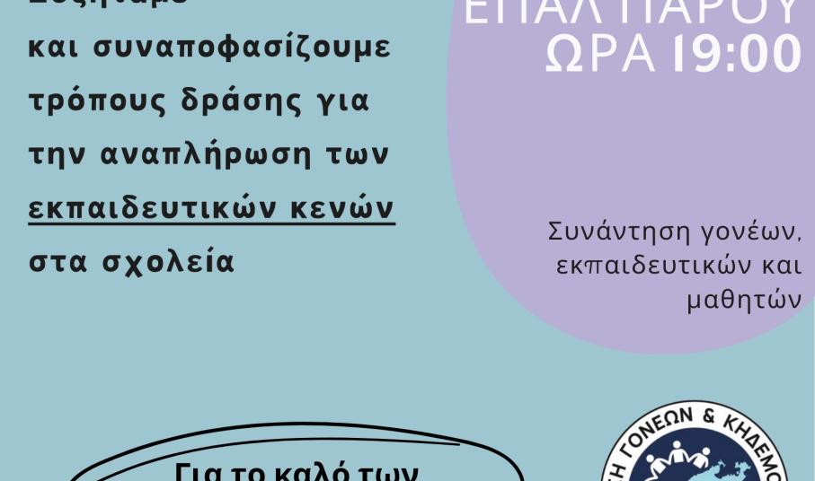 Ανακοίνωση για τα εκπαιδευτικά κενά στην Πάρο, εξέδωσε η Ένωση Γονέων & Κηδεμόνων Πάρου.