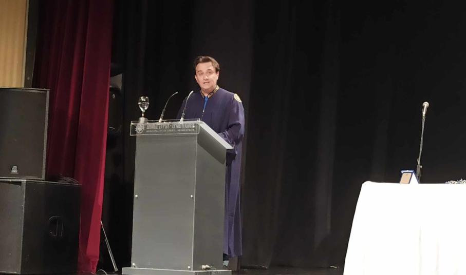 "Το συγκεκριμένο Τμήμα το διαπνέει η διεπιστημονικότητα και η καινοτομία. Είναι ένα Τμήμα, που κόντρα στις συνθήκες δημιουργίας του, πρωτοπόρησε και είδε πολύ νωρίς αυτά που έρχονταν", σημείωσε χαρακτηριστικά και απευθυνόμενος προς τους απόφοιτους, δήλωσε ότι "η εκδήλωση καθομολόγησης είναι μία ημέρα χαράς για όλους εσάς που καταφέρατε να υλοποιήσετε τα σχέδια που είχατε θέσει, πριν περάσετε την πόρτα του Πανεπιστημίου. Η τελετή αποφοίτησης είναι ένας πολύπλευρος συμβολισμός, μία γλυκιά αίσθηση, η πρώτη επιβράβευση, αλλά και η ελπίδα για τη νέα ζωή που ανοίγετε μπροστά σας".