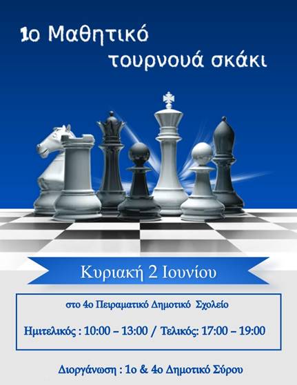 Το 1ο μαθητικό τουρνουά σκάκι διοργανώνουν το 1ο Δημοτικό και το 4ο Πειραματικό Ερμούπολης, το οποίο θα λάβει χώρα την Κυριακή 2 Ιουνίου στον αύλειο χώρο του 4ου Πειραματικού.