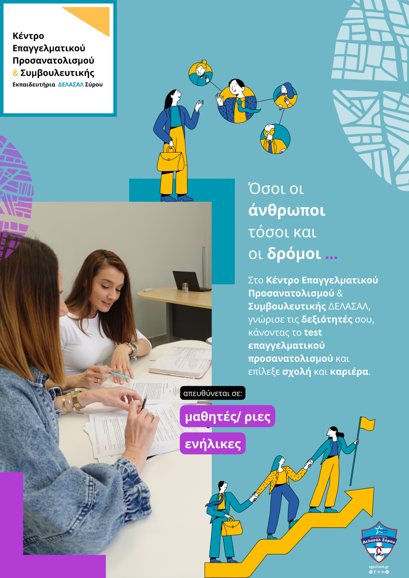 Με επίκεντρο τη γενικότερη προσφορά προς το κοινωνικό σύνολο της Σύρου, τα εκπαιδευτήρια Δελασάλ, έχουν δημιουργήσει το Κέντρο Επαγγελματικού Προσανατολισμού και Συμβουλευτικής.