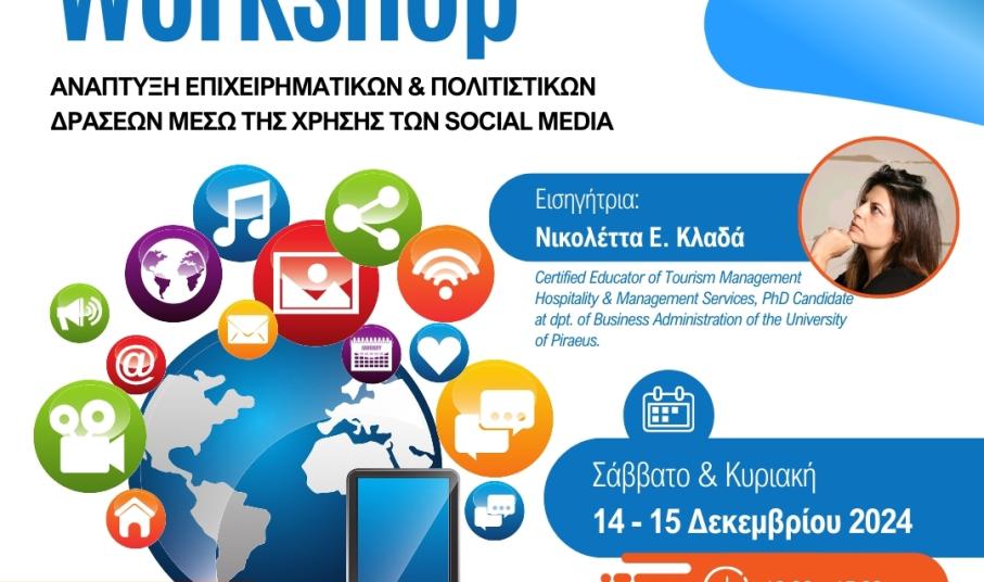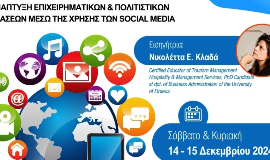 Το ΚΕΚ Γεννηματάς σε συνεργασία με την Περιφέρεια Νοτίου Αιγαίου και το Πανεπιστήμιο Αιγαίου, διοργανώνουν στη Σύρο, το Σάββατο 14 και την Κυριακή 15 Δεκεμβρίου 2024, διήμερο σεμινάριο με θέμα: ΑΝΑΠΤΥΞΗ ΕΠΙΧΕΙΡΗΜΑΤΙΚΩΝ & ΠΟΛΙΤΙΣΤΙΚΩΝ ΔΡΑΣΕΩΝ ΜΕΣΩ ΤΗΣ ΧΡΗΣΗΣ ΤΩΝ SOCIAL MEDIA.
