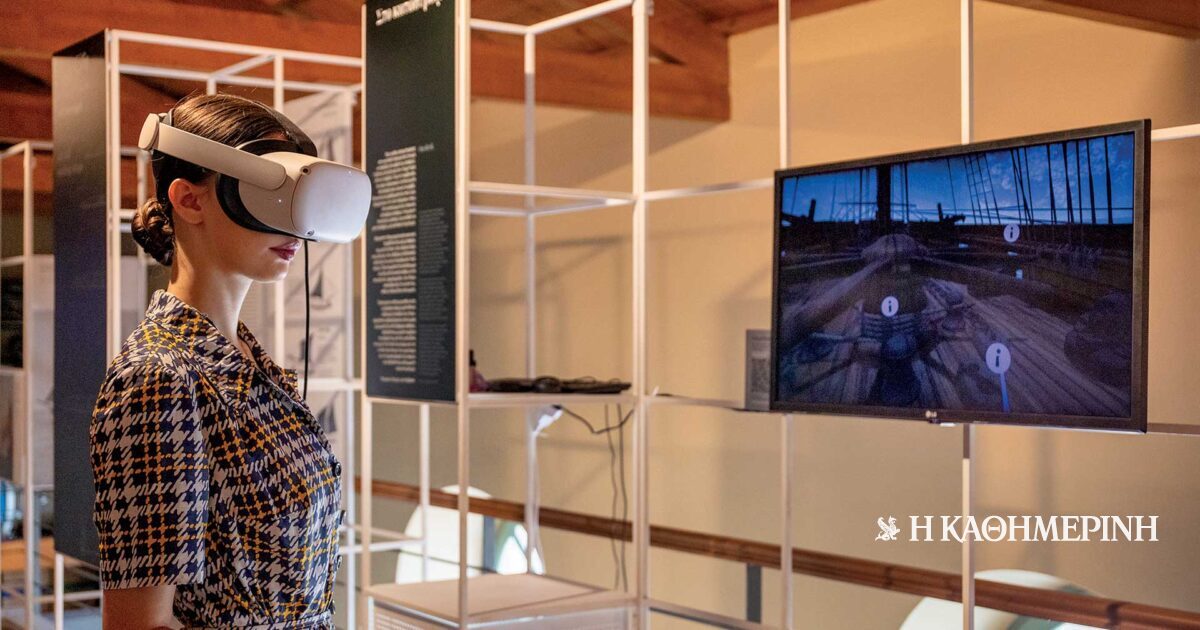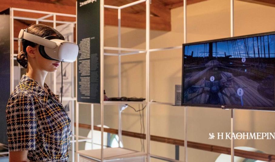 Κεντρική φωτογραφία: Η φοιτήτρια Γεωργία Ψαθά παρουσιάζει την εφαρμογή εικονικής πραγματικότητας «Στο κατάστρωμα».