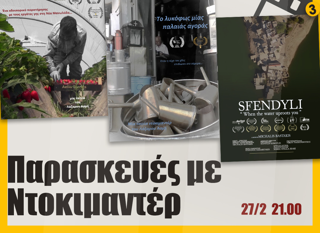 Αύριο Παρασκευή, 27 Φεβρουαρίου στις 9 το βράδυ στην Αίθουσα Τουλούπη (συγκρότημα Λυκείων Άνω Μάννα), θα προβληθούν τρία ντοκιμαντέρ μικρού μήκους και συγκεκριμένα η