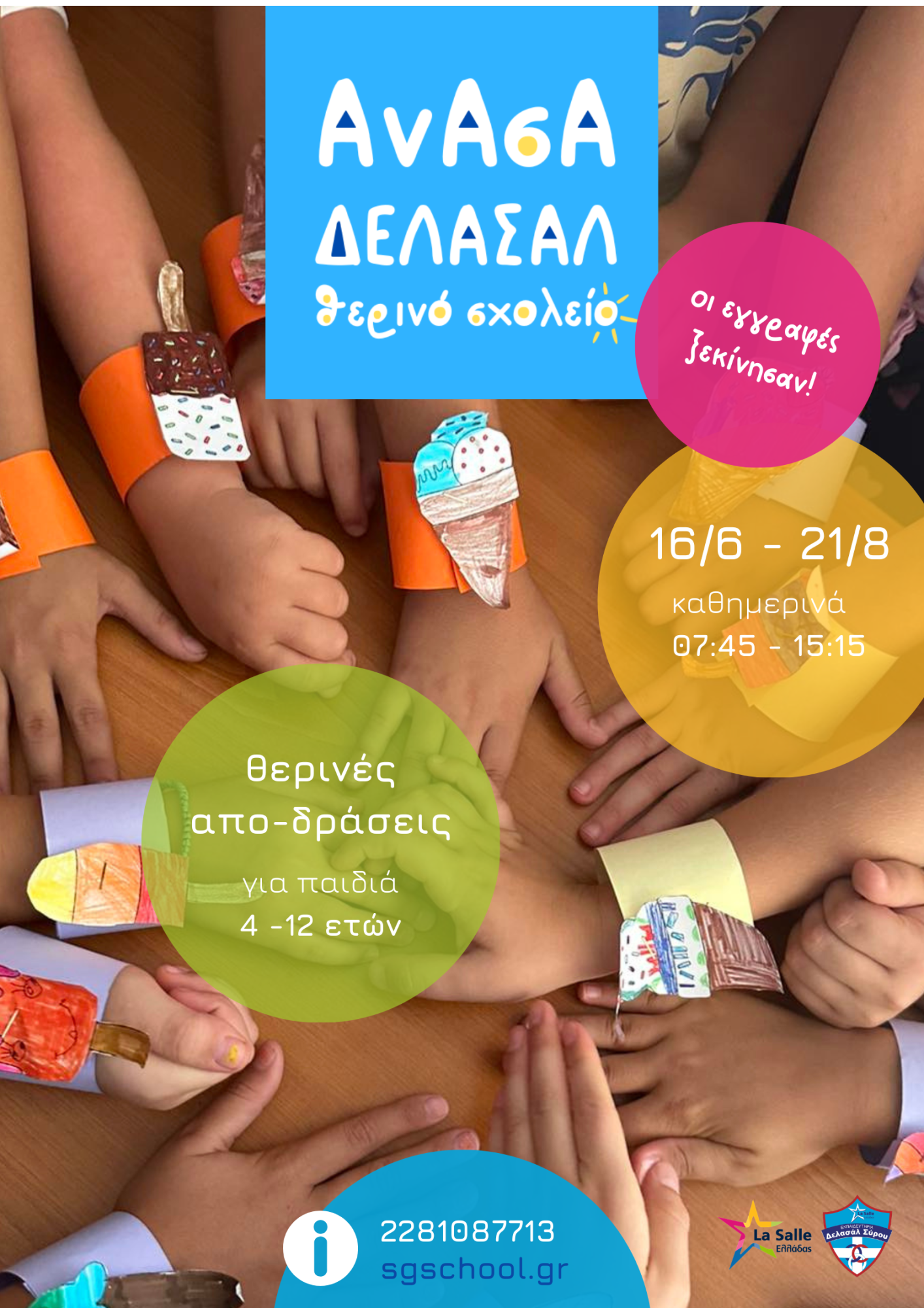 Μία ακόμη σχολική χρονιά ολοκληρώνεται και τα Εκπαιδευτήρια ΔΕΛΑΣΑΛ Σύρου ετοιμάζονται να υποδεχθούν θερινό σχολείο ΑΝΑΣΑ, ένα πρόγραμμα που κάθε καλοκαίρι κερδίζει τις καλύτερες εντυπώσεις από γονείς, παιδιά και εκπαιδευτικούς.