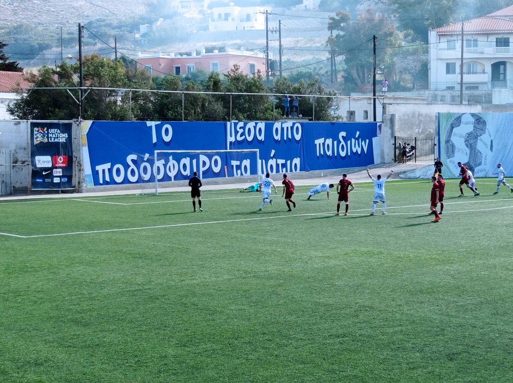 31΄ ο Ρέντζο έβγαλε με το κεφάλι πριν η μπάλα περάσει τη γραμμή του τέρματος του Καλογερόπουλου, με την Ελλάς Σύρου να φτάνει κοντά στο γκολ.