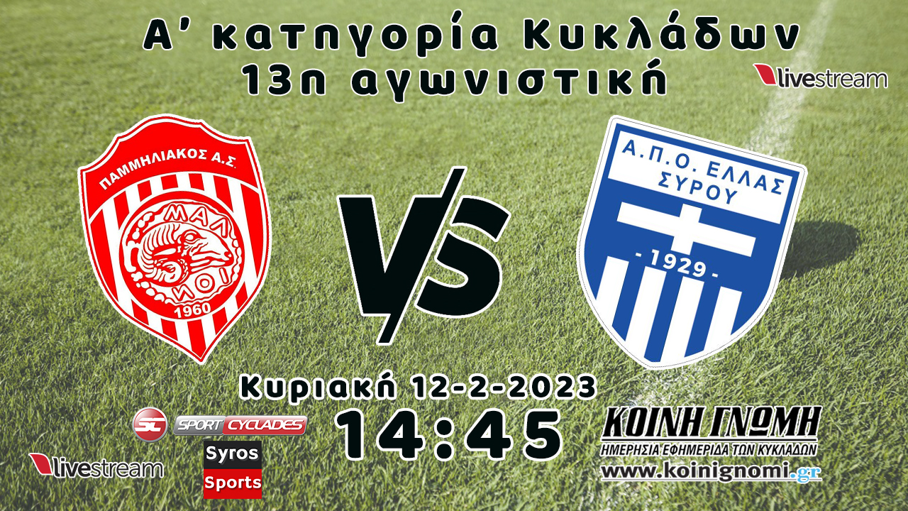 Παρακολουθήστε σε ζωντανή μετάδοση από το στάδιο της Μήλου την αναμέτρηση της 13ης αγωνιστικής της Α' κατηγορίας της ΕΠΣ Κυκλάδων μεταξύ του Παμμηλιακού και της Ελλάς Σύρου.