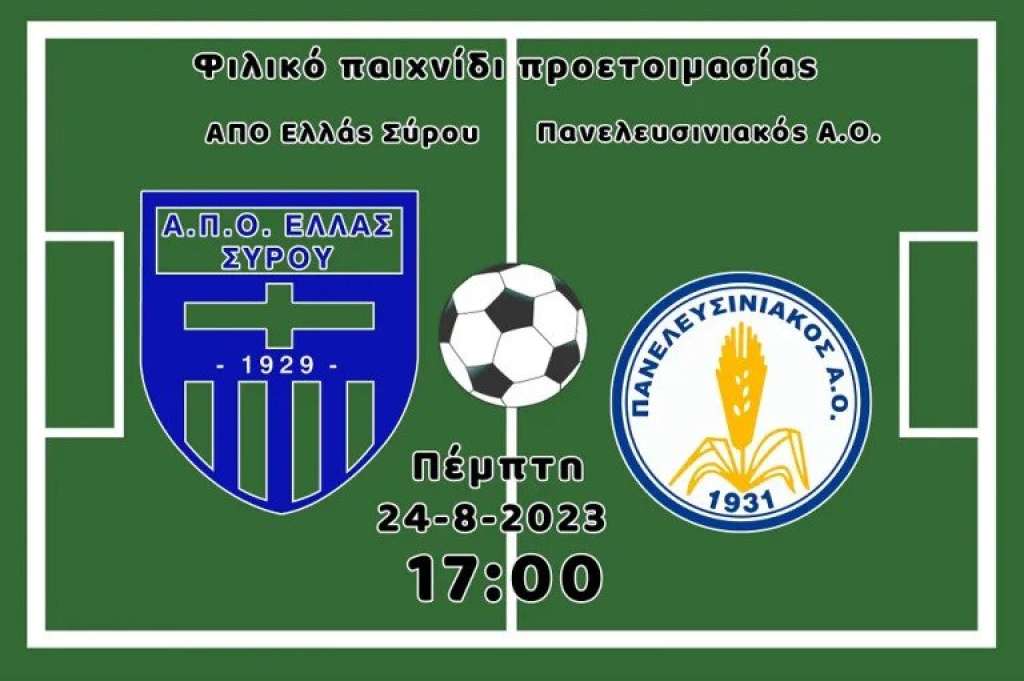 Το τρίτος της φιλικό παιχνίδι ετοιμάζεται να δώσει στα πλαίσια της προετοιμασίας της η Ελλάς Σύρου. Η ομάδα του Παναγιώτη Χριστοφιλέα την Πέμπτη στις 17:00 θα φιλοξενήσει στο γήπεδο της Ερμούπολης τον Πανελευσινιακό. Οι δύο ομάδες στο πρωτάθλημα της Γ’ Εθνικής κατηγορίας.