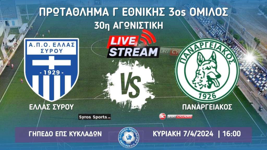 Παρακολουθήστε σε ζωντανή μετάδοση (7/4/2024 | 13:30) από το γήπεδο της ΕΠΣ Κυκλάδων στην Ερμούπολη την αναμέτρηση της 30ης αγωνιστικής του 3ου ομίλου της Γ' Εθνικής μεταξύ της Ελλάς Σύρου και του Παναιγιάλειου.