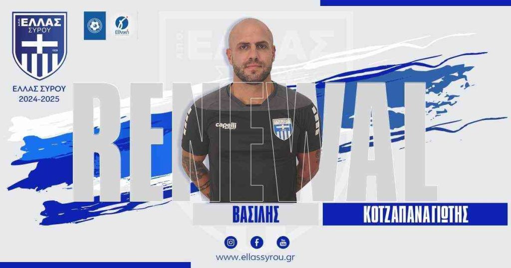 Στο πόστο του θα παραμείνει και τη νέα αγωνιστική περίοδο ο Βασίλης Κοτζαπαναγιώτης. Η Ελλάς Σύρου κάνει πράξη με τον καλύτερο τρόπο το ρητό που αναφέρει πως… ομάδα που κερδίζει δεν αλλάζει. Η διοίκηση από την αρχή είχε ως στόχο να κρατήσει στην ομάδα όσους περισσοτέρους αθλητές γίνεται, αλλά και να παραμείνει το τεχνικό επιτελείο ως έχει.