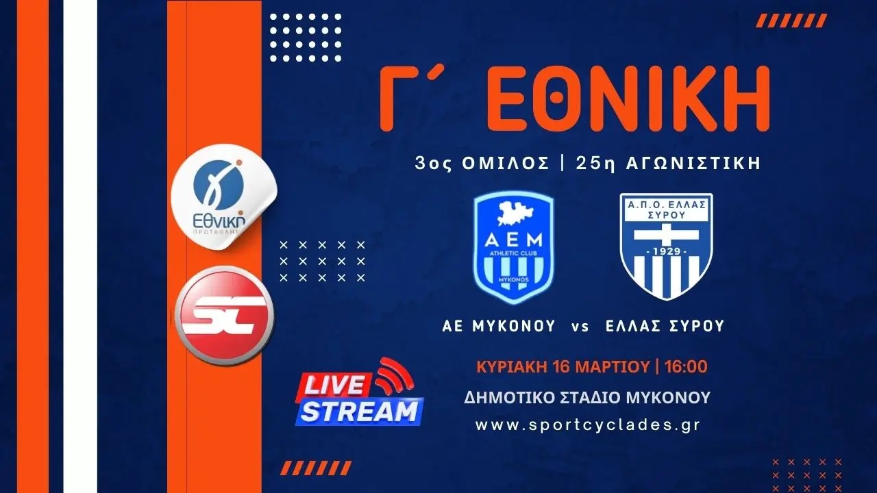- Live stream: ΑΕ Μυκόνου – Ελλάς Σύρου (Γ΄ Εθνική | 3ος Όμιλος | 25η Αγωνιστική)