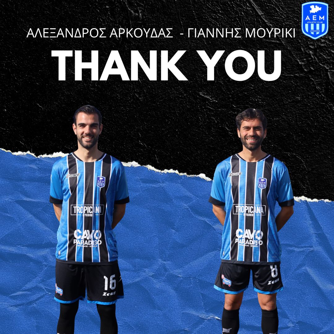 Η Αθλητική Ένωση Μυκόνου ανακοινώνει τη λύση της συνεργασίας της με τους ποδοσφαιριστές Αλέξανδρο Αρκούδα και Γιάννη Μουρίκι.