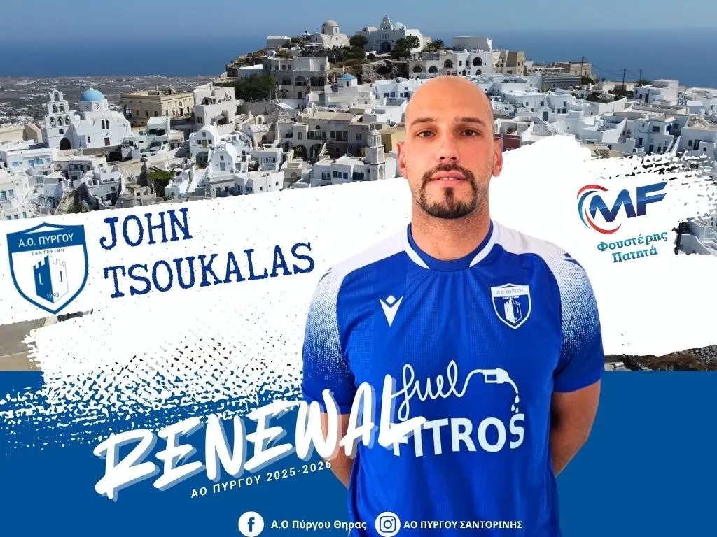 Κάτοικος Σαντορίνης για ακόμη μία χρονιά θα παραμείνει ο Γιάννης Τσουκαλάς, ο οποίος τα βρήκε σε όλα και ανανέωσε τη συνεργασία του με τον Α.Ο. Πύργου.
