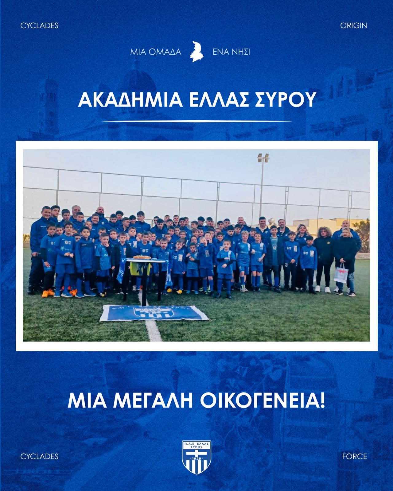 Ευχαριστούμε για άλλη μια φορά τους Ntanos Bakery - Cafe και hotel nisaki για τη στήριξή τους! Με μόλις 5 χρόνια λειτουργίας της Ακαδημίας, 110 παιδιά έχουν ενταχθεί σε 7 πολύ ποιοτικά τμήματα της οικογένειας της Ελλάς Σύρου. Ευχαριστούμε θερμά για την εμπιστοσύνη που μας δείχνετε και υποσχόμαστε να μεριμνούμε καθημερινά για την ολόπλευρη διάπλαση των μικρών αθλητών μας!”.