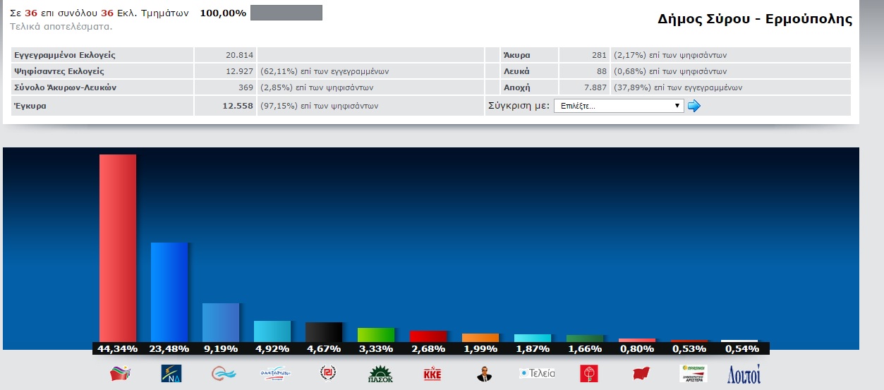 Σύμφωνα με το 100% των αποτελεσμάτων τα ποσοστά των κομμάτων για τη Σύρο διαμορφώθηκαν ως εξής: