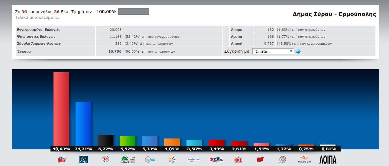Λίγο μετά τις έντεκα και μισή το βράδυ ολοκληρώθηκε η καταμέτρηση των αποτελεσμάτων στα 36 εκλογικά τμήματα της Σύρου, με τον ΣΥΡΙΖΑ να προηγείται της Νέας Δημοκρατίας με σημαντική διαφορά και να καταγράφει ποσοστό 40,63%.