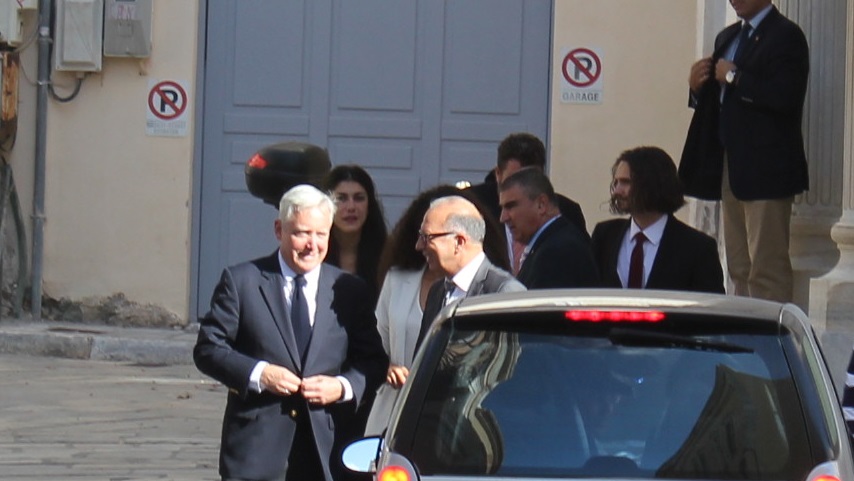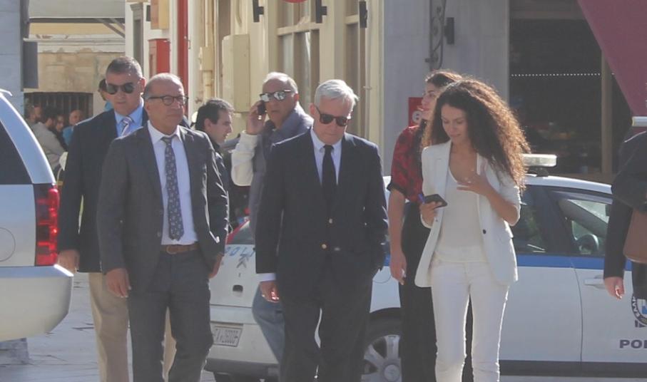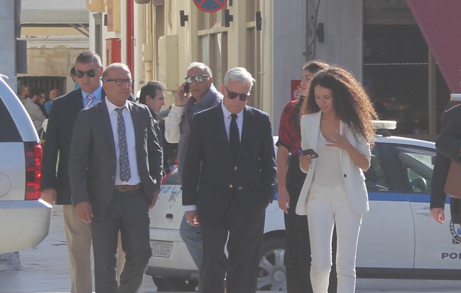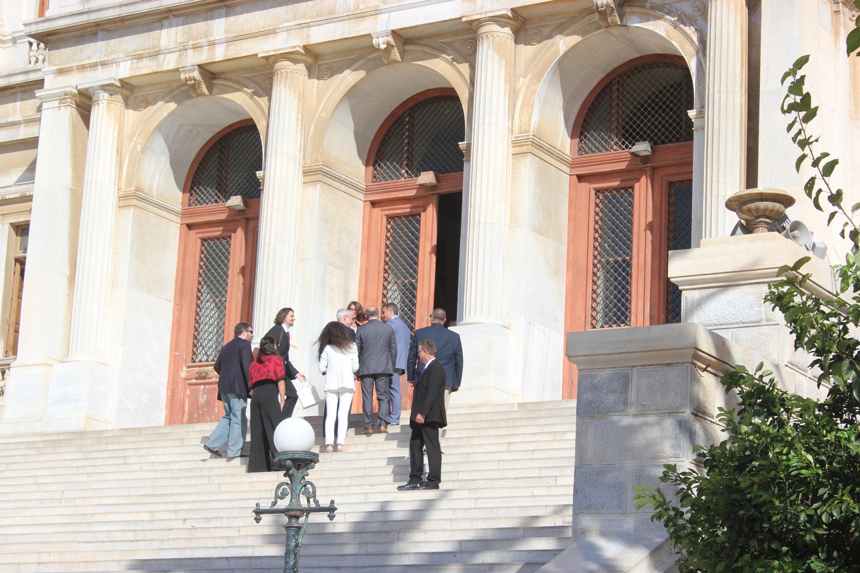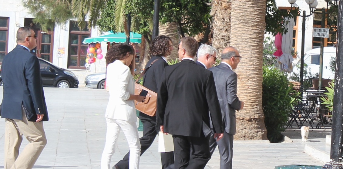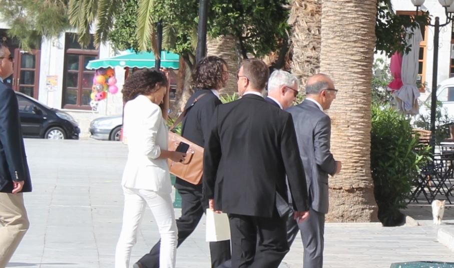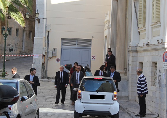 Υπό δρακόντεια μέτρα ασφαλείας λίγο πριν τις δέκα μετέβη στο γραφείο του Αντιπεριφερειάρχη Κυκλάδων, Γιώργου Λεονταρίτη με τον οποίο είχε προγραμματισμένη συνάντηση, ενώ συνοδευόμενος από τον ίδιο επισκέφθηκε ακολούθως και τον Δήμαρχο, Γιώργο Μαραγκό.