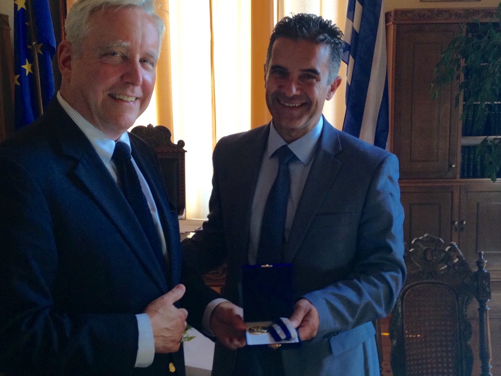 Σήμερα, Πέμπτη 1η Οκτωβρίου 2015, στο Δημαρχιακό Μέγαρο Σύρου – Ερμούπολης πραγματοποιήθηκε, σε πολύ καλό κλίμα, προγραμματισμένη συνάντηση μεταξύ του Αμερικανού Πρέσβη στην Ελλάδα, κ. David D. Pearce, με το Δήμαρχο Σύρου – Ερμούπολης, κ. Γιώργο Μαραγκό, την Πρόεδρο του Δημοτικού Συμβουλίου, κα Μαρία Καζαντζάκη και το Δημοτικό Σύμβουλο, κ. Γιώργο Δούναβη.