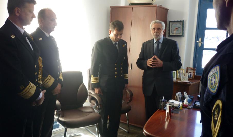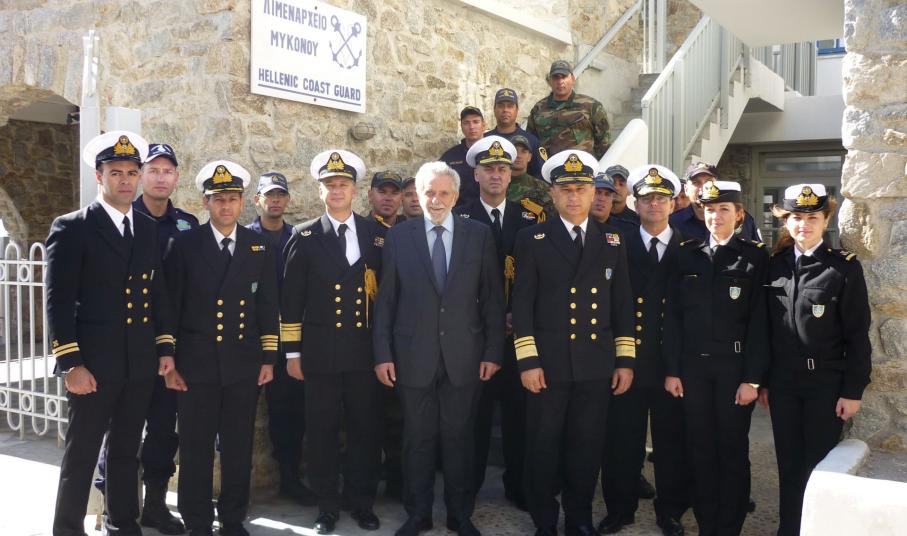 Ο Υπουργός Ναυτιλίας και Νησιωτικής Πολιτικής κ. Θοδωρής Δρίτσας και ο Αρχηγός του Λιμενικού Σώματος – Ελληνικής Ακτοφυλακής Αντιναύαρχος Λ.Σ. Σταμάτιος Ράπτης, στο πλαίσιο των εορταστικών εκδηλώσεων που πραγματοποιήθηκαν την 19 και 20 Οκτωβρίου 2016, για τη μνήμη του Πολιούχου Μυκόνου, Αγίου Μεγαλομάρτυρα Αρτεμίου, επισκέφθηκαν και τη Λιμενική Αρχή Μυκόνου, συνοδευόμενοι από τον Α’ Υπαρχηγό του Λ.Σ. – ΕΛ.ΑΚΤ. Αντιναύαρχο Λ.Σ. Θεόδωρο Κλιάρη και το Διοικητή της 6ης Περιφερειακής Διοίκησης Λ.Σ. –ΕΛ.ΑΚΤ. Αρχιπλοίαρχο Λ.Σ. Χαράλαμπο Αϊβαλιώτη.