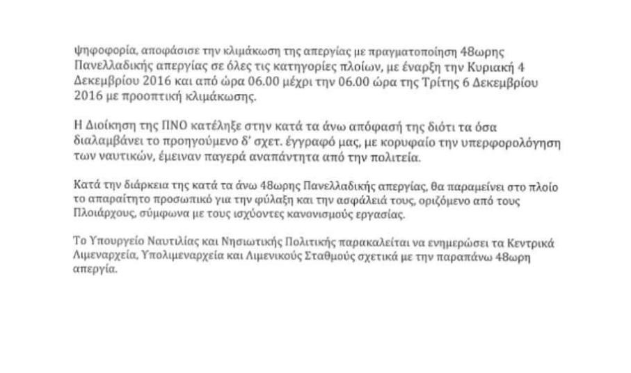 H Διοίκηση της Πανελλήνιας Ναυτικής Ομοσπονδίας, στην συνέχεια του από 29 Δεκεμβρίου 2016 δελτίου τύπου με το οποίο και ανακοίνωνε την απόφασή της για την πραγματοποίηση πανελλαδικής 48ωρης προειδοποιητικής απεργίας, για τα φλέγοντα θέματα που απασχολούν τον κλάδο των ναυτικών με προεξάρχοντα τα θέματα του ασφαλιστικού και φορολογικού, σε όλες τις κατηγορίες πλοίων με προοπτική κλιμάκωσης, κατά την σημερινή συνεδρίασή της, και αφού έλαβε υπόψη της την αδιάλλακτη και ανυποχώρητη θέση της Κυβέρνησης, αποφάσισε να κλιμακώσει τον αγώνα της με την πραγματοποίηση νέας 48ωρης πανελλαδικής απεργίας για όλες τις κατηγορίες πλοίων που θα αρχίζει την 06.01 ώρα της 4 Δεκεμβρίου 2016 ημέρα Κυριακή και θα λήγει την 6 Δεκεμβρίου 06.00 ημέρα Τρίτη και ώρα 06:00, με προοπτική κλιμάκωσης, οπότε και ΟΛΑ ΤΑ ΠΛΟΙΑ ΘΑ ΠΑΡΑΜΕΙΝΟΥΝ ΜΕ ΔΕΜΕΝΟΥΣ ΚΑΒΟΥΣ και δεν θα εκτελεστεί κανένα να δρομολόγιο.