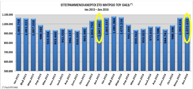 Αντίθετα, με τη φοροκαταιγίδα (με άμεσους και έμμεσους φόρους στα εισοδήματα κάθε νοικοκυριού και εργαζόμενου) και την εκ νέου αύξηση του μη μισθολογικού κόστους (tax wedge), οδήγησε σε περαιτέρω αύξηση -κατά 24.991 περισσότερους- τους εγγεγραμμένους ανέργους στον ΟΑΕΔ σε σχέση με τον αντίστοιχο μήνα Δεκέμβριο του 2015».