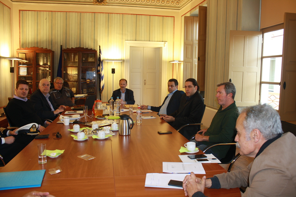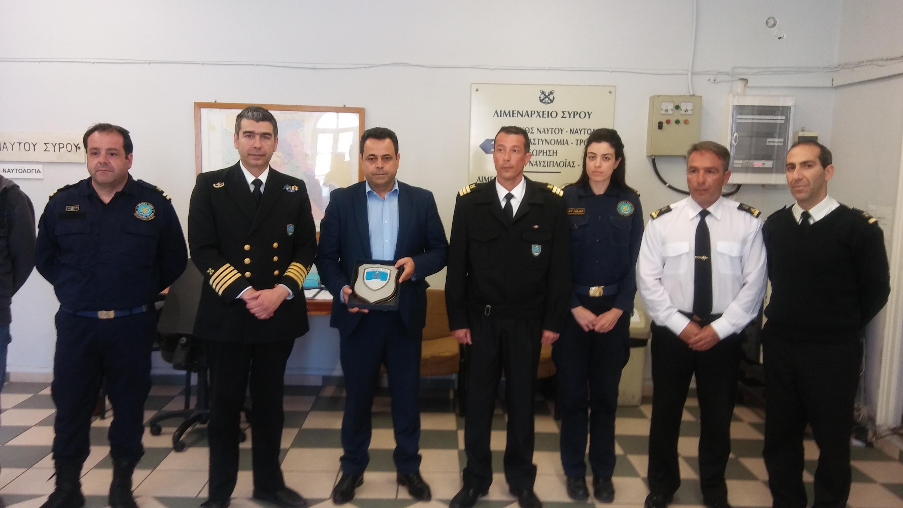 Στη συνέχεια των επαφών που είχε στη Σύρο, ο Υφυπουργός Ναυτιλίας και Νησιωτικής Πολιτικής, επισκέφθηκε το Δημαρχείο του νησιού όπου συζήτησε με τον Δήμαρχο Ερμούπολης, κ. Γιώργο Μαραγκό, τον Πρόεδρο του Δημοτικού Συμβουλίου, κ. Γιώργο Δούναβη καθώς και με τον Πρόεδρο του Δημοτικού Λιμενικού Ταμείου, κ. Δημήτρη Κοσμά. Η συζήτηση κινήθηκε, βασικά, γύρω από το πολύ σημαντικό θέμα του πολεοδομικού σχεδίου του Δήμου Ερμούπολης, το οποίο πρόσφατα εγκρίθηκε από την αρμόδια επιτροπή της Γενικής Γραμματείας Αιγαίου και έτσι σύντομα οδεύει προς λύση ένα ζήτημα που ταλάνιζε την τοπική κοινωνία για πολύ καιρό. Επιπλέον, στη συνάντηση αναφέρθηκε και το εξίσου σοβαρό θέμα του master plan του Λιμανιού της Σύρου. Αυτή τη στιγμή, αναμένεται να ολοκληρωθούν οι απαραίτητες ενέργειες ώστε να προχωρήσει η διαδικασία έγκρισής του και έτσι να ανοίξει ο δρόμος προς την υλοποίηση των έργων αναβάθμισης του λιμανιού, που θα σημάνουν και την αναπτυξιακή άνοδο του νησιού. Ο Υφυπουργός, ενημερώθηκε, επίσης, για το αίτημα του Δήμου για επέκταση του αεροδρομίου Σύρου.