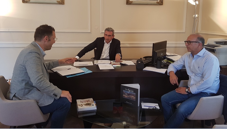 Με τον Περιφερειάρχη Νοτίου Αιγαίου Γιώργο Χατζημάρκο και τον Αντιπεριφερειάρχη Κυκλάδων Γιώργο Λεονταρίτη συναντήθηκε σήμερα, κατ' εξουσιοδότηση του Δημάρχου Τήνου Σίμου Ορφανού, ο Πρόεδρος του Δημοτικού Συμβουλίου Τήνου Γιάννης Σιώτος.
