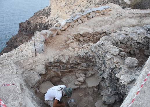 Οι ανασκαφικές τομές διανοίχθηκαν φέτος στη νότια πλευρά του λόφου της Κοίμησης, στην ίδια ισοϋψή με άλλα κτίρια του οικισμού που εντοπίστηκαν τις προηγούμενες περιόδους, δηλαδή το μεγάλο ελλειψοειδές κτίσμα και τις μικρότερες κατασκευές, φωλιασμένες με μεγάλη ευρηματικότητα στον μυχό των ηφαιστειακών βράχων. Η ανασκαφική έρευνα επικεντρώθηκε σε σημείο όπου κατά την γεωφυσική έρευνα είχαν εντοπιστεί πιθανά αρχιτεκτονικά κατάλοιπα εγκιβωτισμένα στα στρώματα της μινωικής έκρηξης. Πράγματι από την πρώτη ώρα της ανασκαφής μέσα στην τέφρα και την ελαφρόπετρα φάνηκαν ισχυρότατοι τοίχοι, ευθύγραμμοι, επιμελημένης κατασκευής εκ των οποίων ο ένας ήταν μήκους περίπου 7 μέτρων. Ο σημαντικότερος  ανεσκαμμένος χώρος κατέβαινε ανασκαφικά σε βάθος δύο μέτρων και με την εύρεση θρανίου που διατρέχει όλο το μήκος του νότιου τοίχου έδωσε ενδιαφέροντα στοιχεία για τη χρήση του χώρου. Η γενική όψη της κατασκευής αυτής και των ευρημάτων της είναι σημαντικά διαφορετική από τις γνωστές έως τώρα του οικισμού. Οι μεγάλοι ευθύγραμμοι τοίχοι και η σχετικά έντονη παρουσία της μεσοκυκλαδικής κεραμικής σε αδιατάρακτα στρώματα υποδεικνύουν ότι πιθανότατα βρισκόμαστε σε ευρύ μεσοκυκλαδικό ορίζοντα (2000-1700 π.Χ. περίπου), που ίσως ενσωματώνει προγενέστερες ισχυρές κατασκευές της Πρωτοκυκλαδικής περιόδου. Ακόμη είναι νωρίς για εικασίες ως προς τον χαρακτήρα των τοίχων, αν αποτελούσαν δηλαδή τμήμα αμυντικού περιβόλου ή τμήμα οικιών.