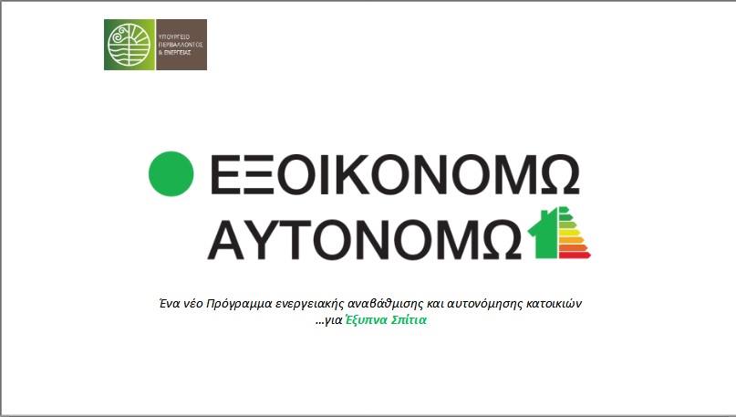 Το υπουργείο Περιβάλλοντος και Ενέργειας αναρτά σήμερα στην ιστοσελίδα του (www.ypeka.gr) τα βασικά σημεία του Οδηγού του προγράμματος, ενόψει της έκδοσης της Κοινής Υπουργικής Απόφασης για την προκήρυξη του ΕΞΟΙΚΟΝΟΜΩ-ΑΥΤΟΝΟΜΩ που θα εκδοθεί το αμέσως επόμενο διάστημα.