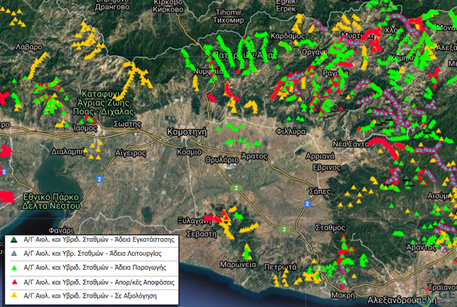 Συγχρόνως, αιτήματα βρίσκονται σε αξιολόγηση για τοποθέτηση ανεμογεννητριών και στους πρόποδες της οροσειράς Ροδόπης, βόρεια της Κομοτηνής.